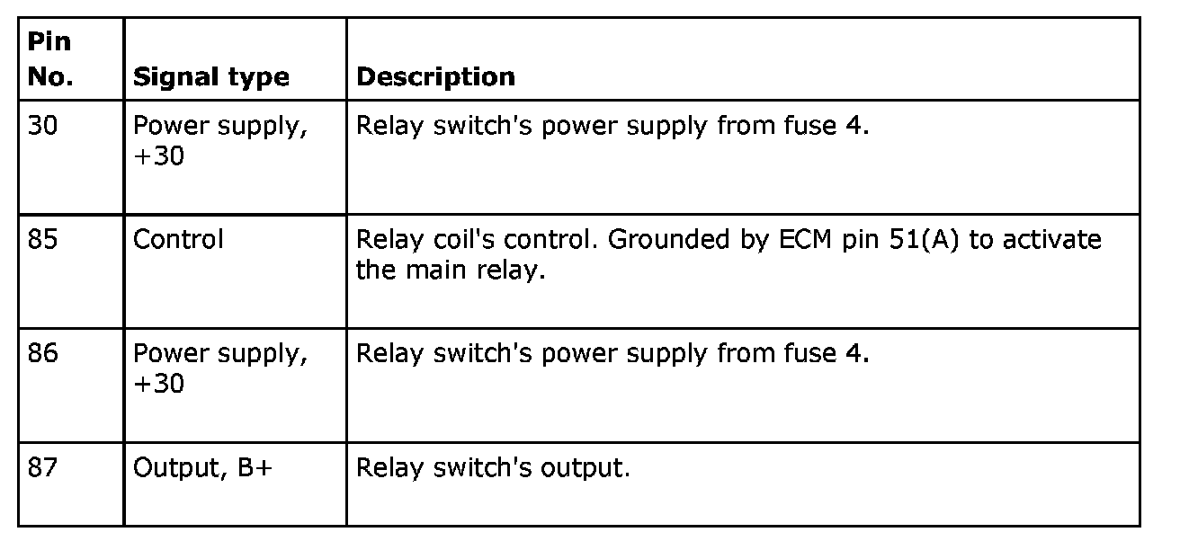 When the ignition is switched "ON", +15 is supplied to control modules pins 19(A) and 2(A). The control module thereby grounds pin A1 and the main relay pulls. At the same time, the control module receives supply voltage on pins 48(A) and 64(A) from main relay pin 87. The control module supply is used internally to feed the throttle motor.