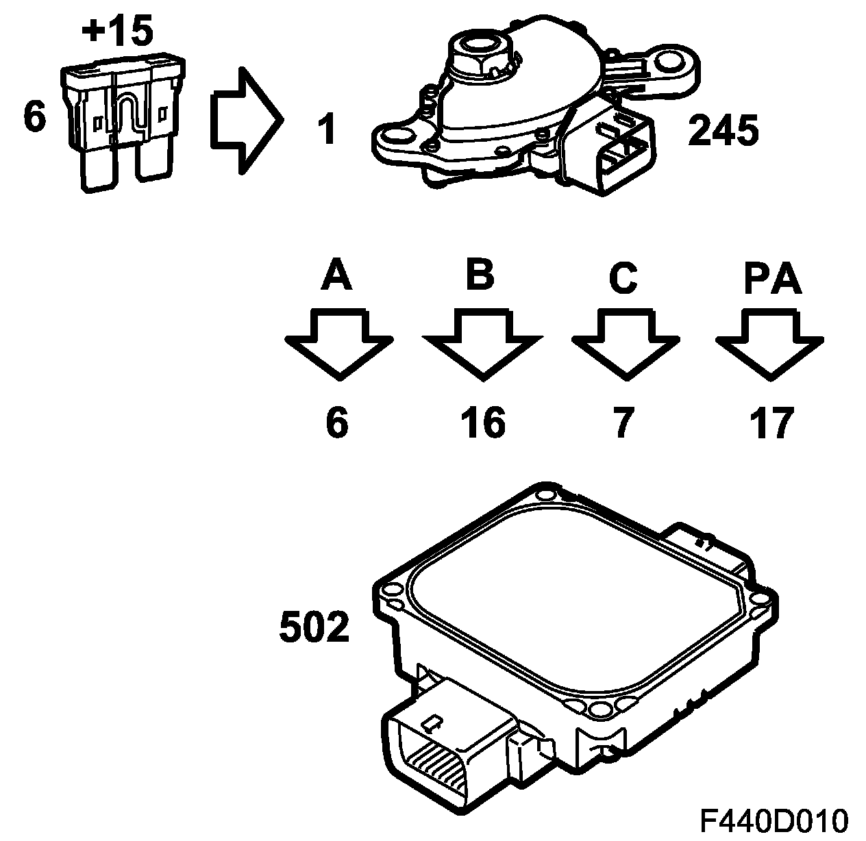 The transmission range switch is a position switch that is powered via +15 from fuse 6 in Rear electric center 342. A number of slip contacts provide the current to the sensor outputs. A combination of terminals A, B, C and PA provide the current selector lever position (see table).The slip contacts can be either closed (ON) or open (OFF).