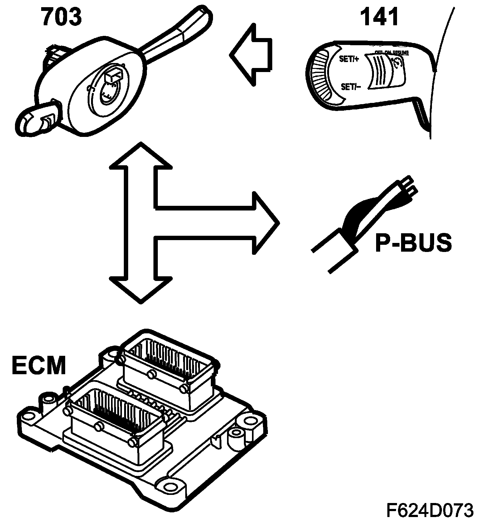 Cruise control is operated with a switch on the direction indicator stalk. The switch (141) is an integrated part of CIM (703), which sends the position of the switch as bus messages.