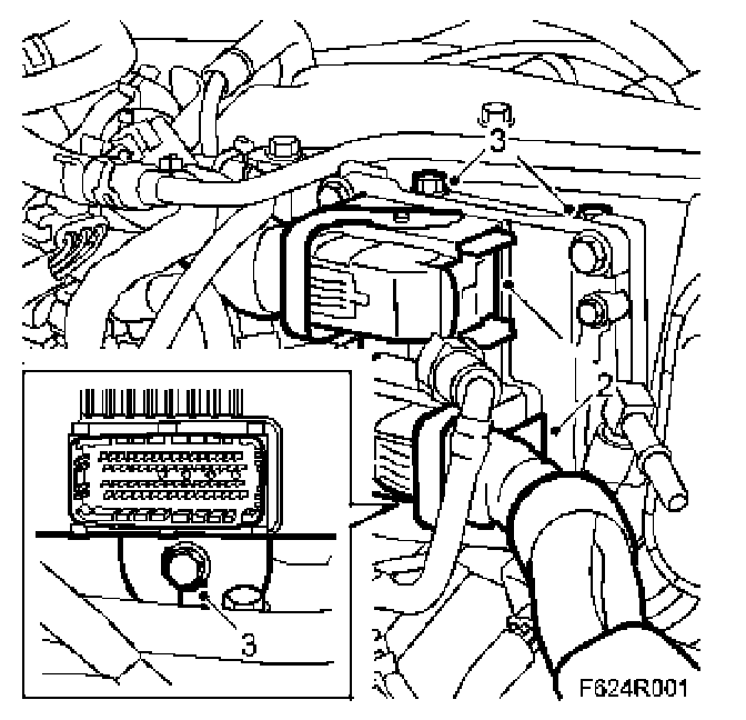 3. Remove the engine control module with mounting and move it aside. The lower hole of the mounting is slotted.