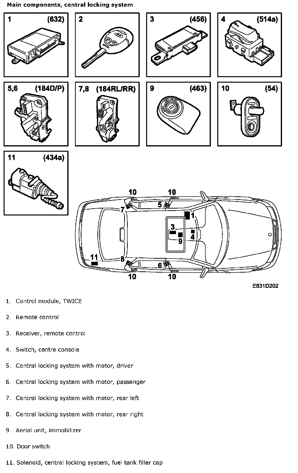 Main components, central locking system: