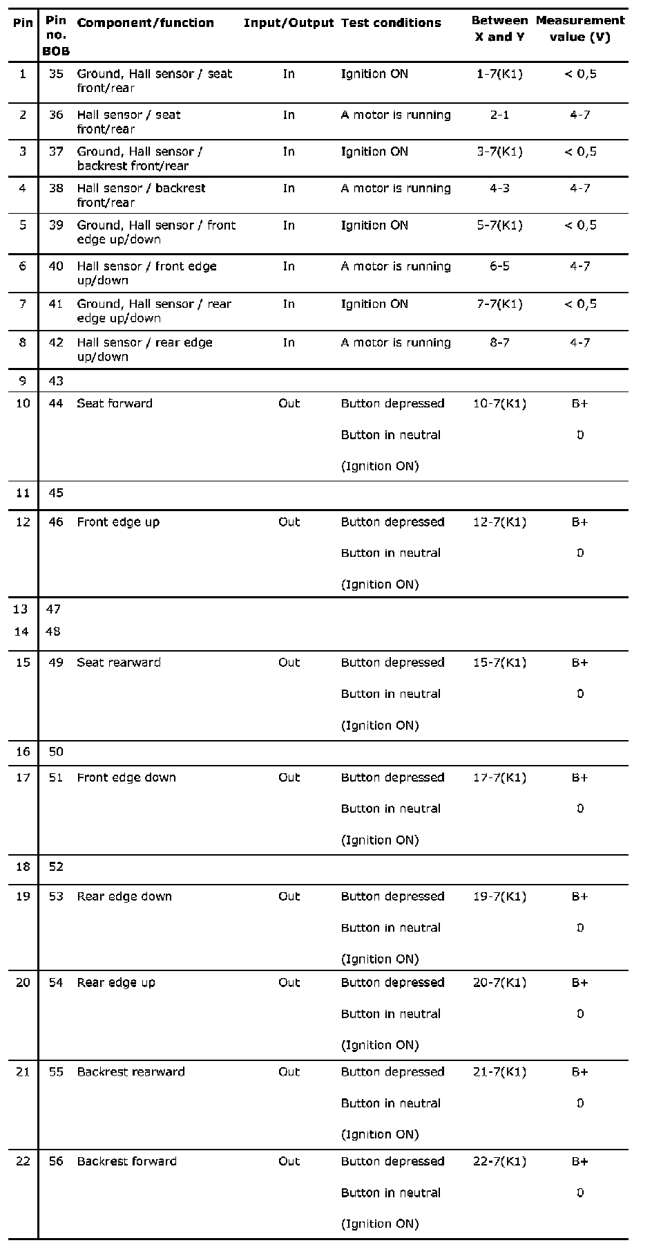 Connector 1 (K1), test readings