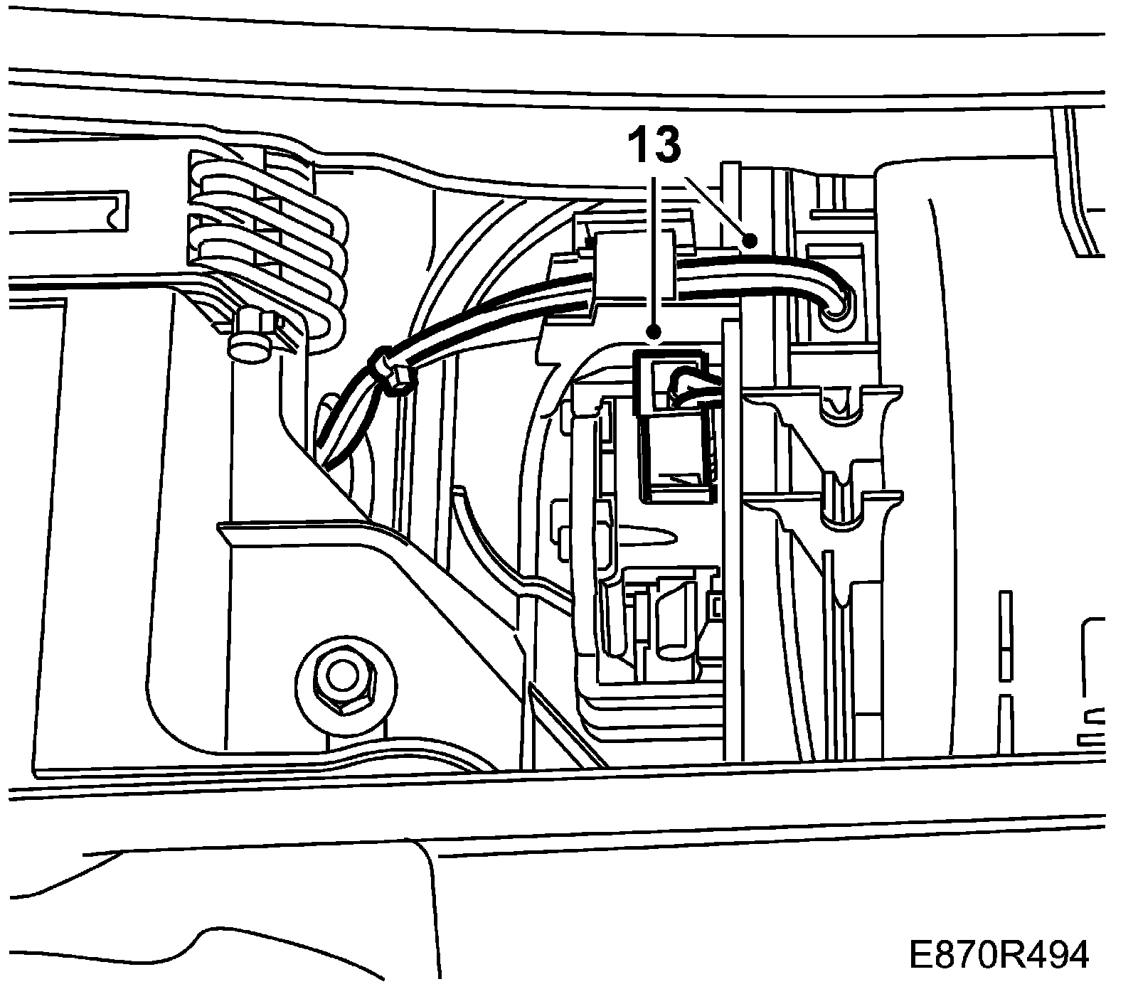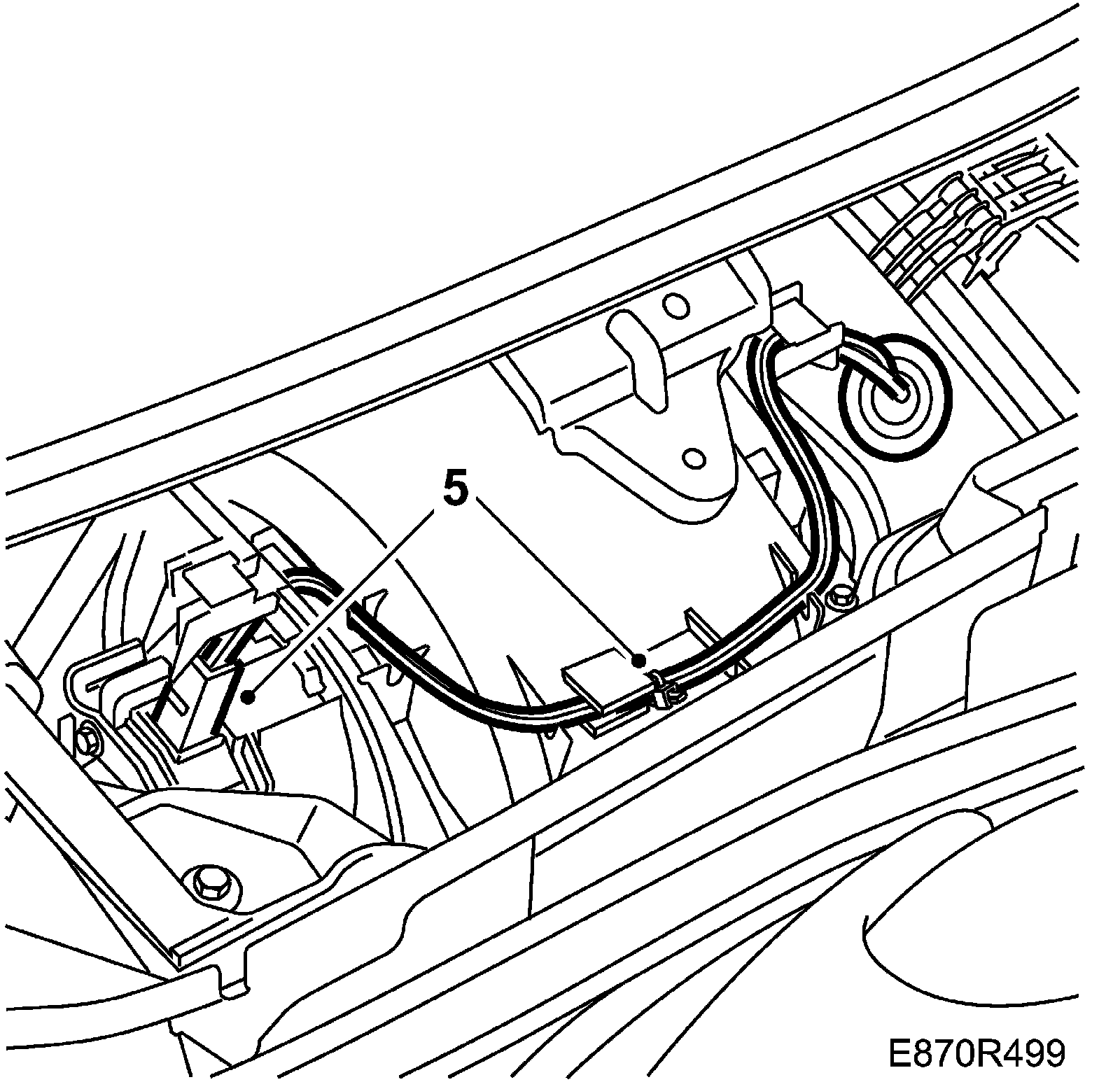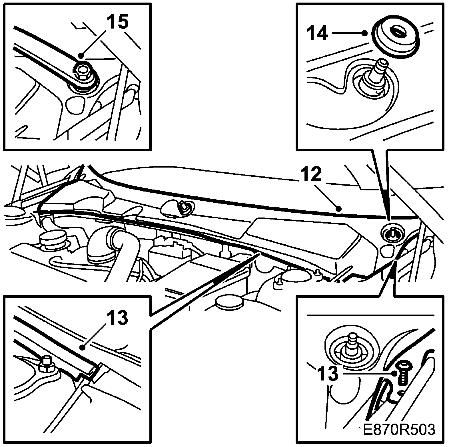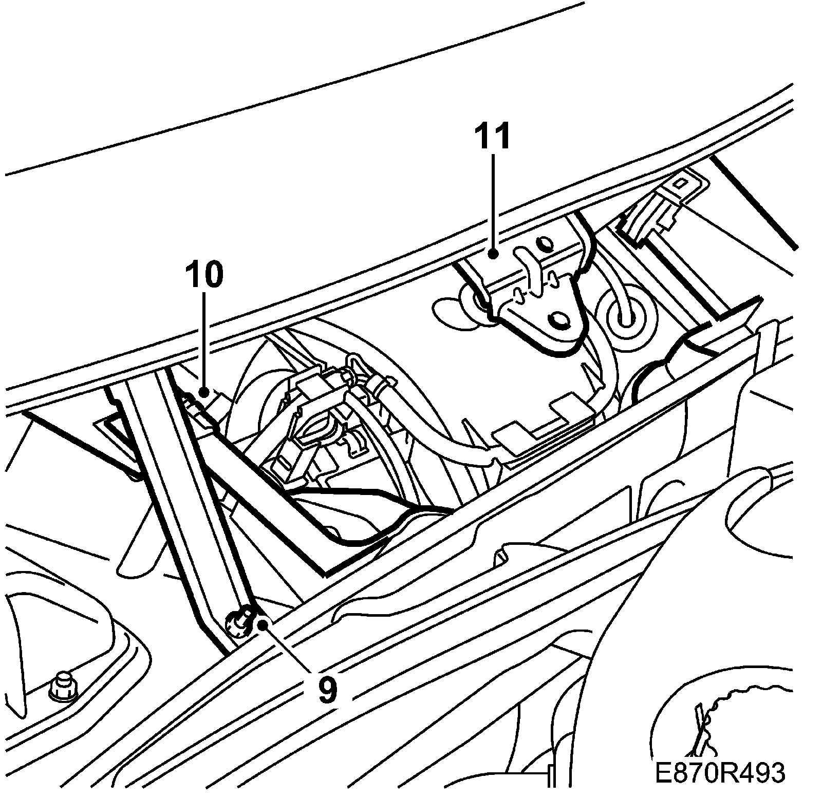 12. Insert the cover over the bulkhead from the rear, against the windscreen. Move the bonnet locking cable to the side and mount it in the groove.