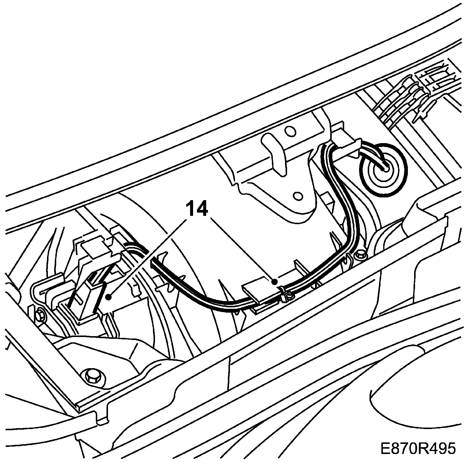 14 RHD: Cut the cable tie and detach the connector to the ventilation fan. Detach and extract the connector from the cover.