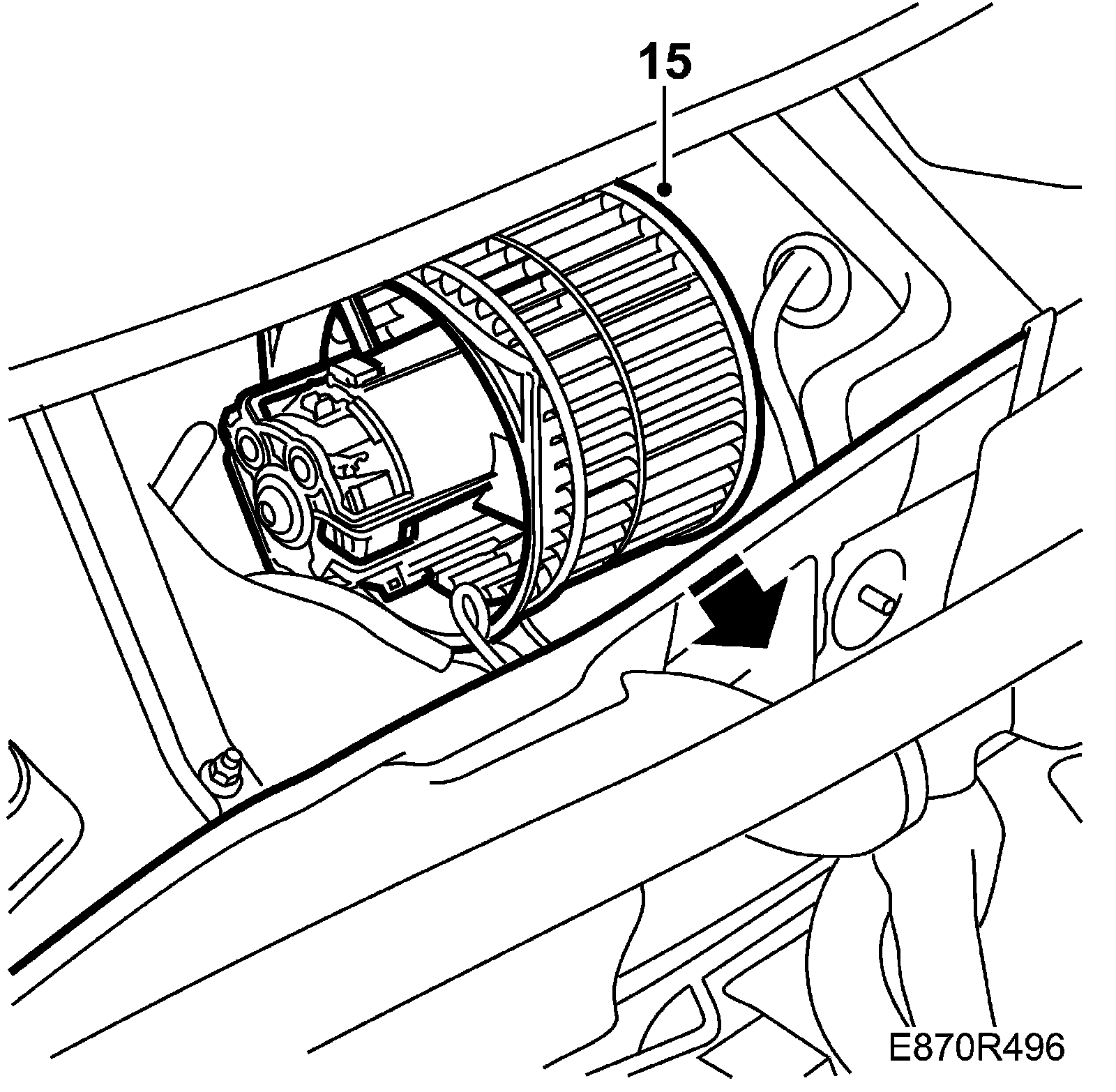 15. Bend forward the bulkhead panel slightly to make it easier to remove the fan from the bulkhead partition space. At the same time, lift the fan and angle it towards the dismantled stay in order to remove it from the bulkhead partition space.