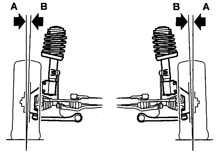 Toe-in is the difference between A and B. If the wheels are exactly parallel, with the two dimensions A and B equal, toe-in will be zero.