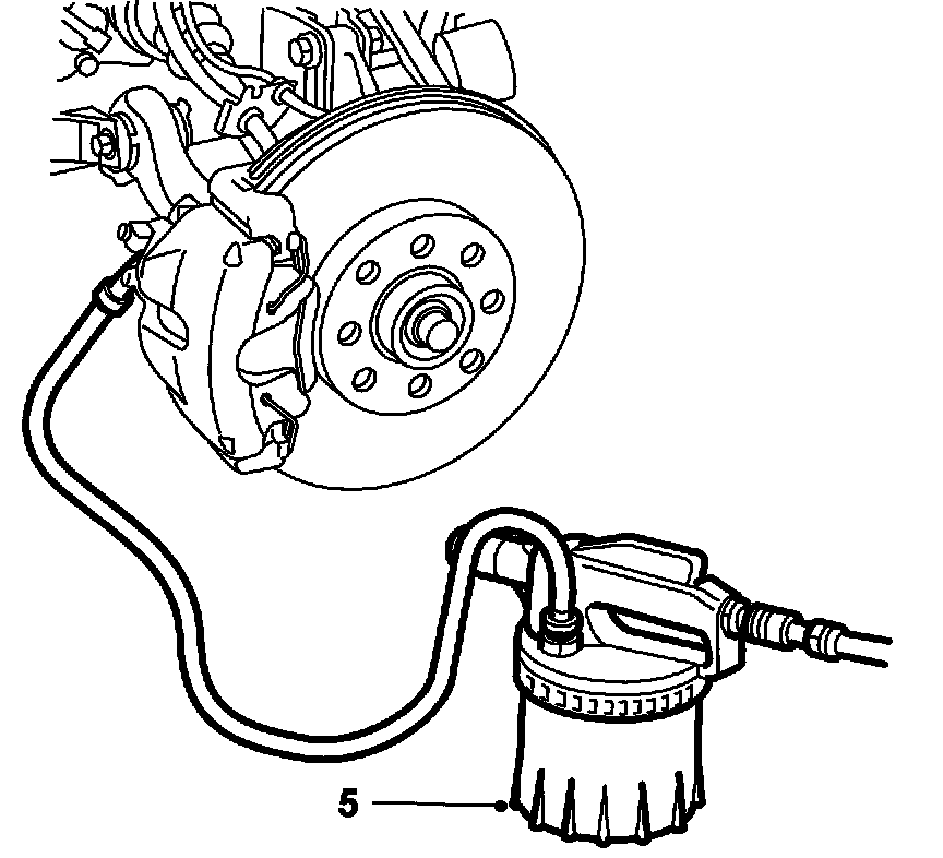 3. Raise the car. Connect the bleeder hose to the air nipple on the front left brake caliper and open the nipple. Drain about 100 ml brake fluid. Use 88 19 096 Bleeding equipment.