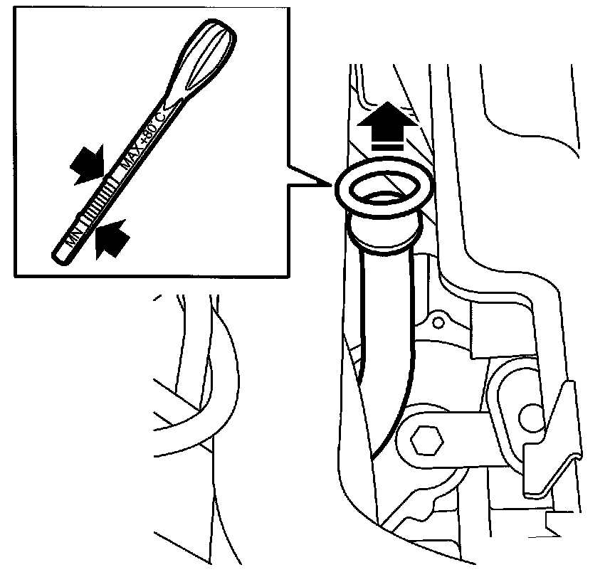 4. Check the fluid level (engine idling and selector lever in position P). Top up as necessary. Pay attention to the appearance of the fluid and its odor. If it is turbid or discolored and/or smells burnt, a change of fluid is advisable even if no complaints have been made about poor shifting performance or excessive noise.