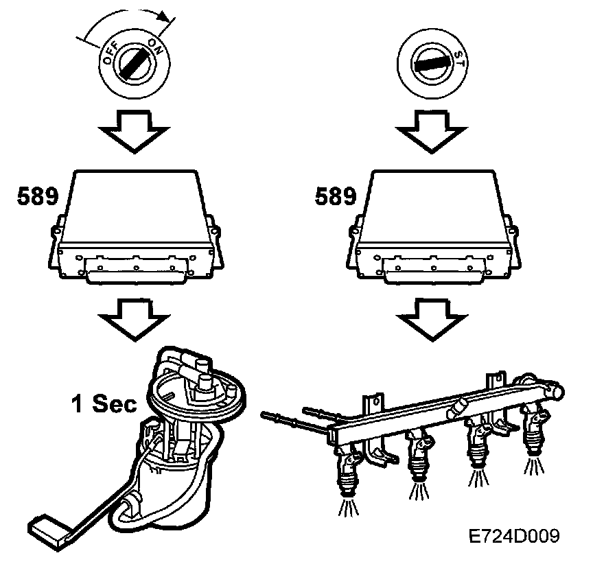 When the ignition is switched on, the control module will be activated and the CHECK ENGINE lamp will go on continuously as a function check. The fuel pump is activated for 1 second so that fuel pressure will build up, after which the control module will await pulses from the crankshaft position sensor.