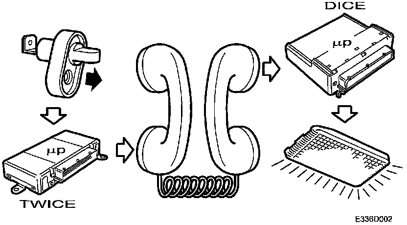 The bus may be regarded as a two-wire telephone line running between the control modules. Communication is continuous once the ignition switched on. With the ignition switched off, a control module that is operative may if necessary awaken the other control modules. This happens for example when a door is opened and TWICE, to which the door switches are connected, awakens the others so that DICE will be able to switch on the interior lighting.