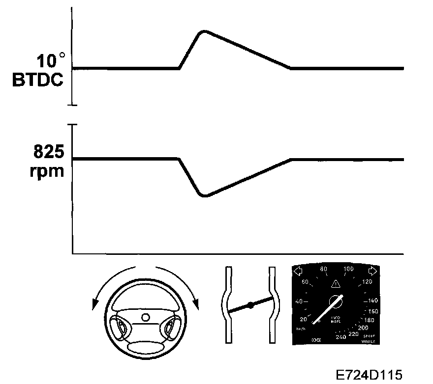 If the current engine speed falls below the requested speed, e.g. when the power steering pump loads the engine as the steering wheel is turned, the ignition is advanced by up to 10 degree.