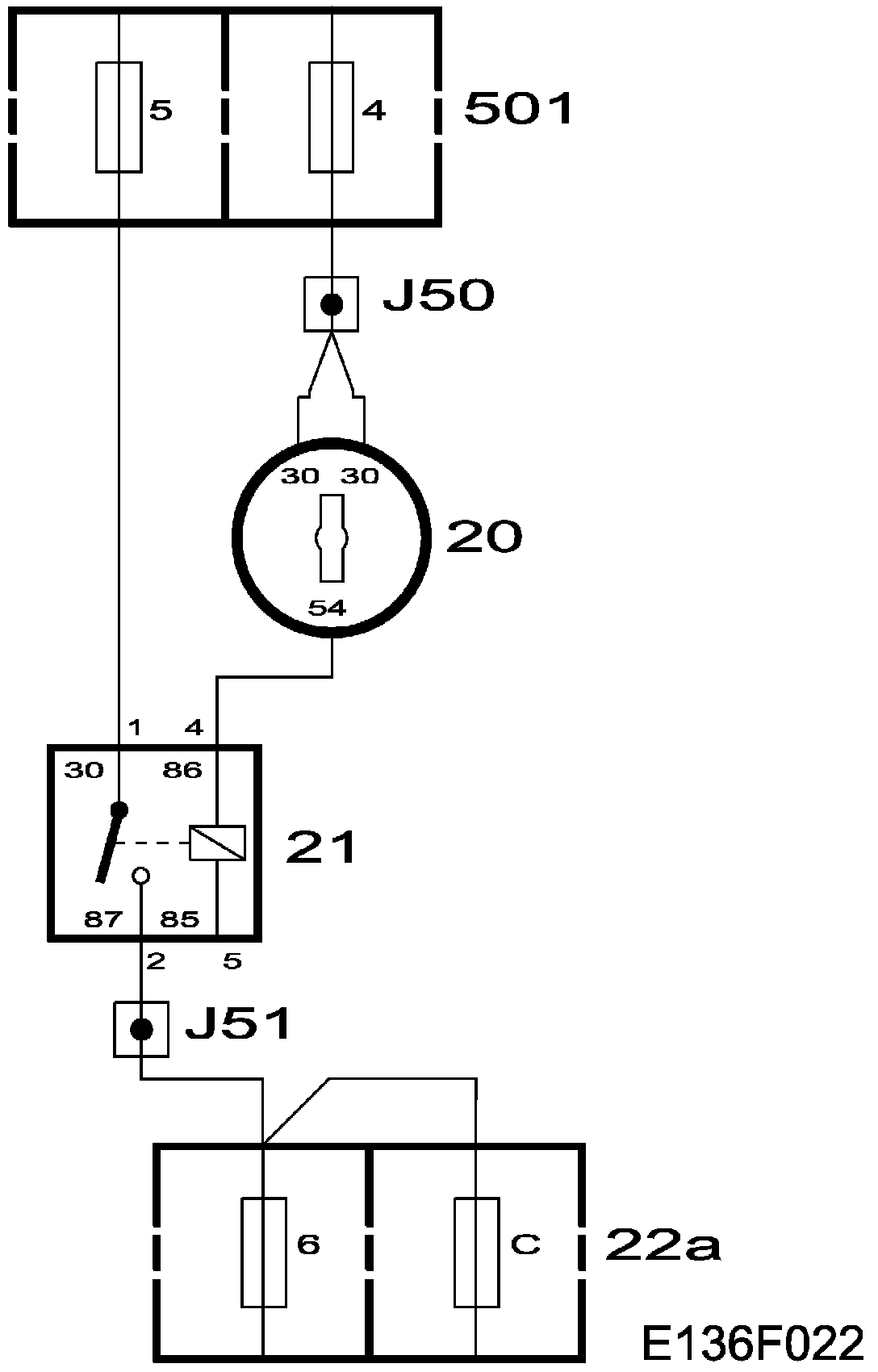 If there is no +54 circuit current when +15 circuit current is present, the DICE control module thinks that the ignition switch is in the START position. DICE then disconnects certain items of electrical equipment to reduce the load on the car battery. If there is no +54 circuit current when +15 circuit current is present for more than 20 seconds, the fault is probably in the car's electrical system as the car starts in less than 20 seconds.