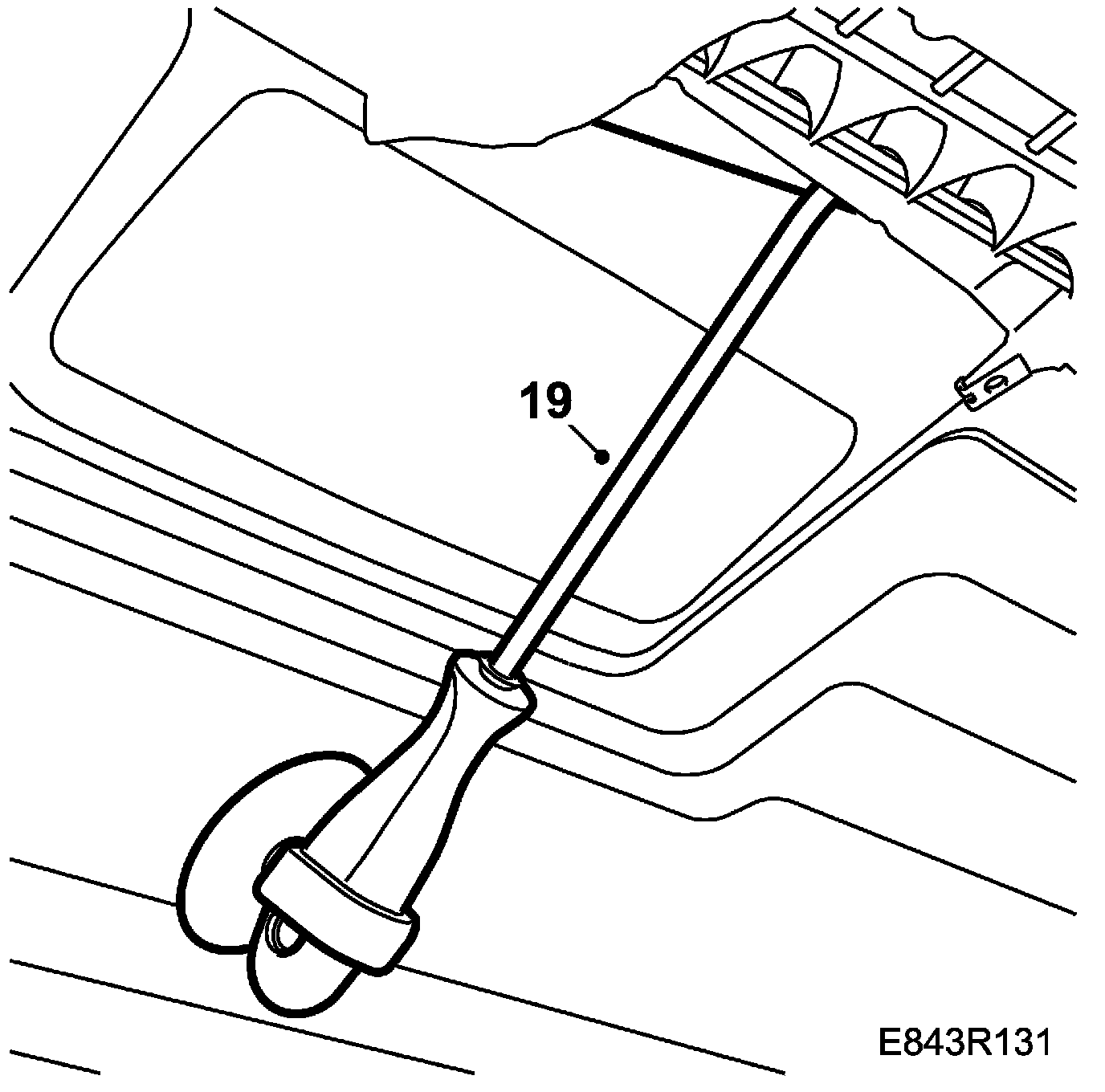 19. Crank with a lock handle so that the wire cuts through the glue joint. If necessary, use the protective tool with suction cups between the cutting wires and the metal so that the wire does not cut the metal or the headlining. Move the whimple little by little to obtain a good angle. A transverse angle with the wire cuts best. If necessary, use the second whimple as support. If the wire seems to be coming off, wait 10-15 seconds so that the wire can work itself into the glue joint.