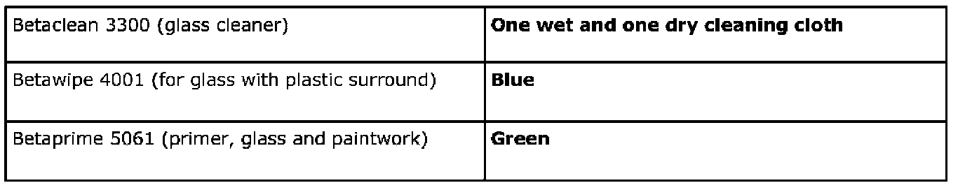 6. Carefully wash the edges of the window with Betawipe 3300. Carefully wipe the edges using the wet cleaning cloth. Dry with the dry cleaning cloth provided in the adhesive kit. Avoid touching the cleaned surface.
