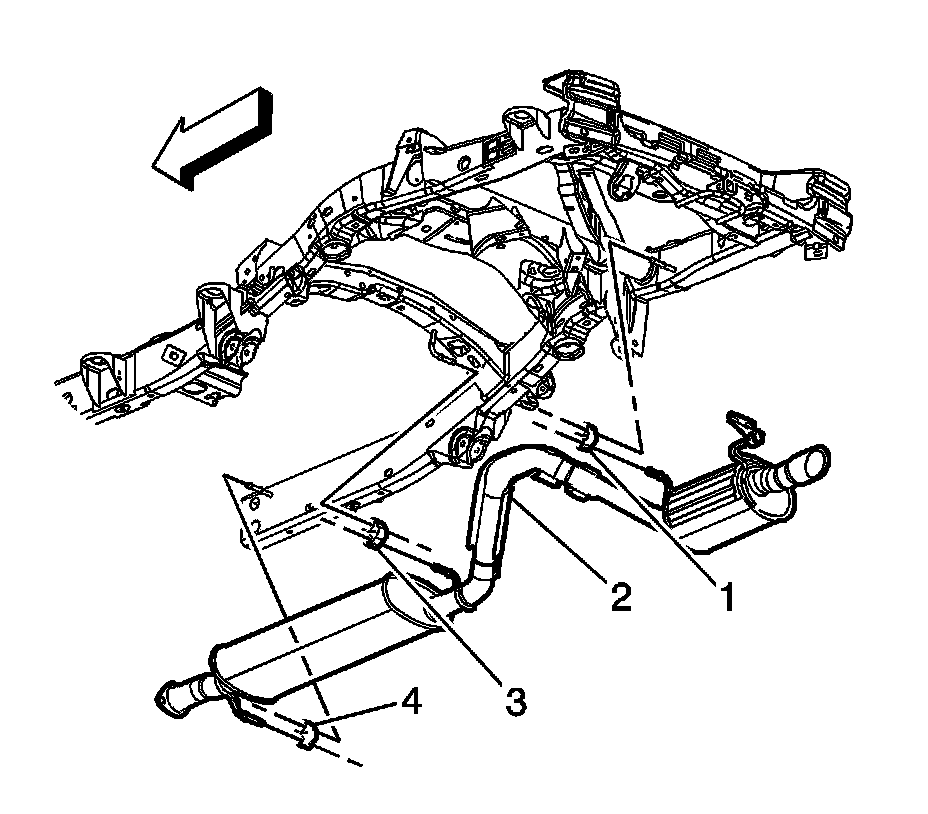 10. With the aid of an assistant, remove the muffler assembly (2) from the vehicle.