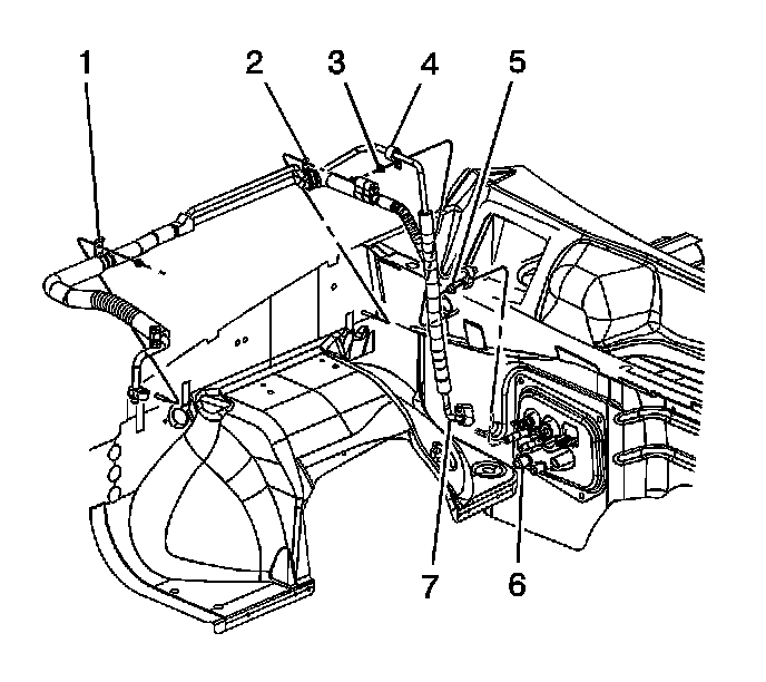 5. Remove the nuts (1, 2) retaining the evaporator tube to the fender.