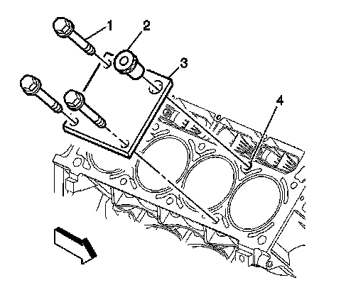 2. Install the fixture plate (3), bolts (1), and bushing (2) onto the engine block deck.