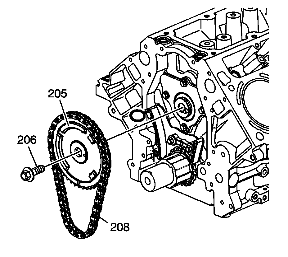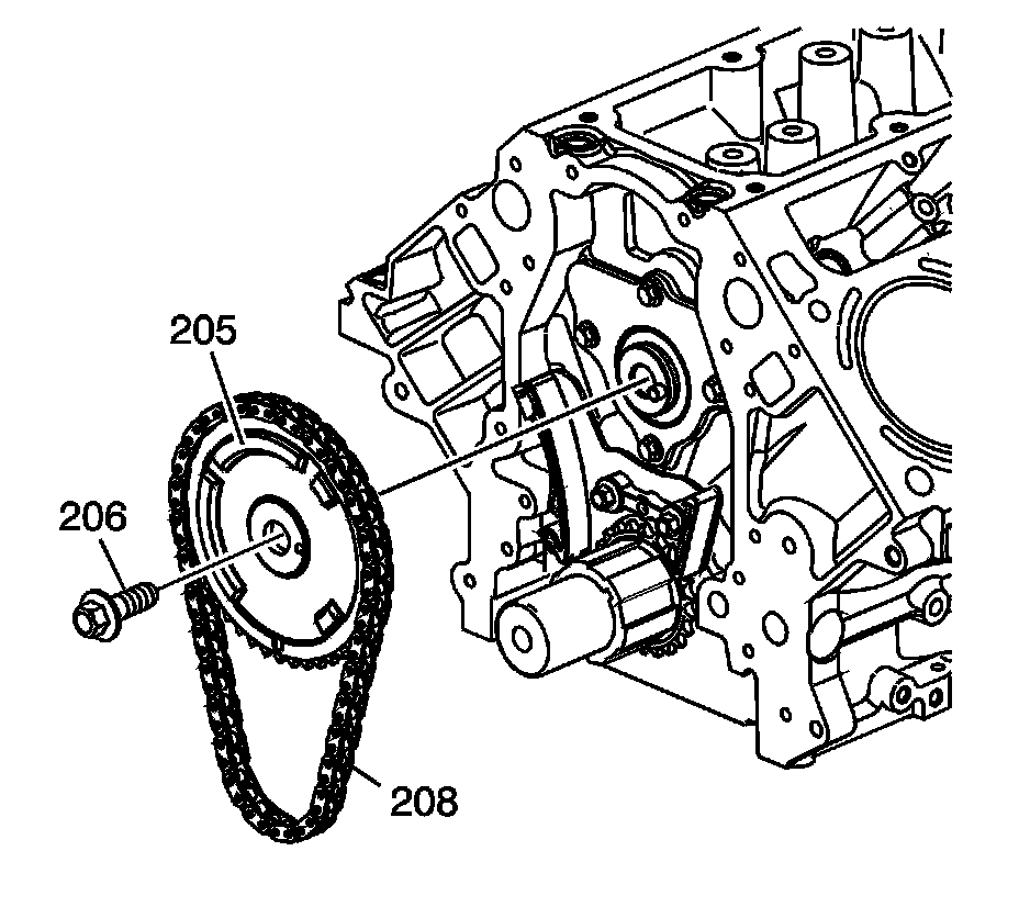 8. Install the camshaft sprocket (205), timing chain (208), and bolt (206).