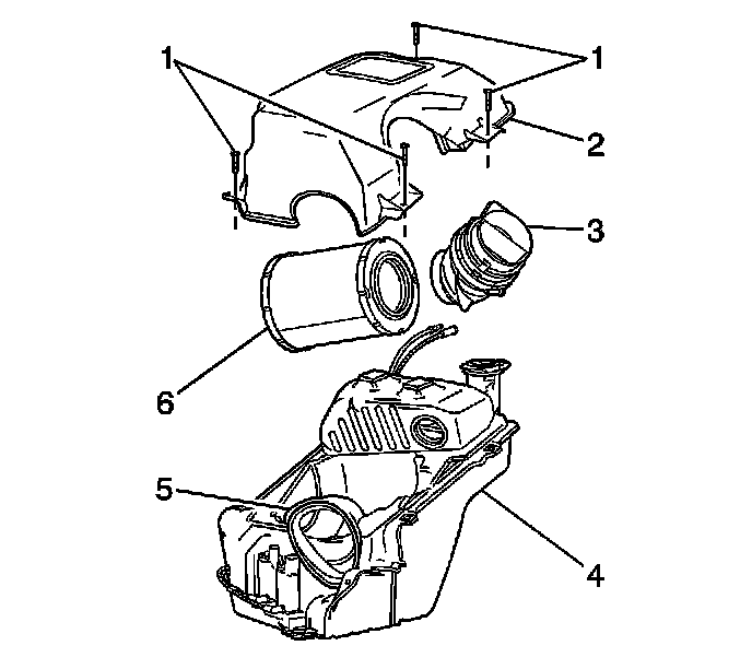 1. Remove the following components from the lower air cleaner housing/washer solvent tank assembly (4):