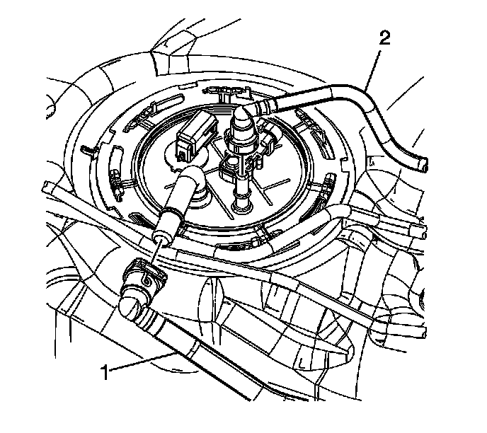 4. Install the fuel feed (1) and EVAP (2) lines to the sender assembly. Refer to Plastic Collar Quick Connect Fitting Service (Plastic Collar Quick Connect Fitting Service).
