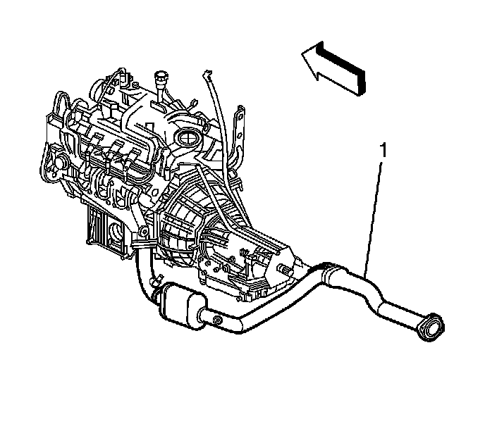 13. Tilt the catalytic converter (1) in order to lower the left side catalytic converter pipe below the vehicle frame. Rotate the catalytic converter outlet pipe toward the left side of the vehicle to gain the necessary clearance for the right side catalytic converter pipe to clear the vehicle frame. Remove the catalytic converter (1) from the vehicle.