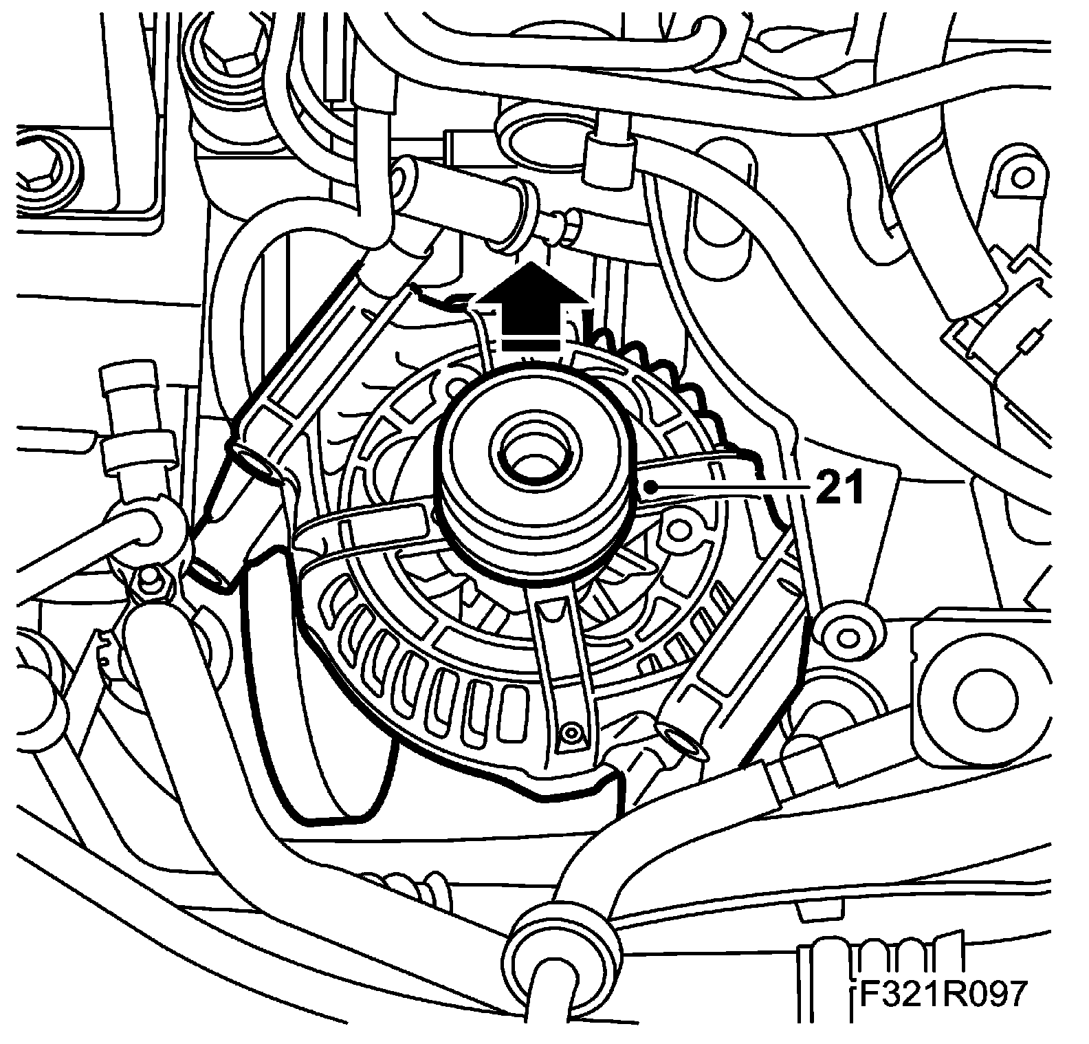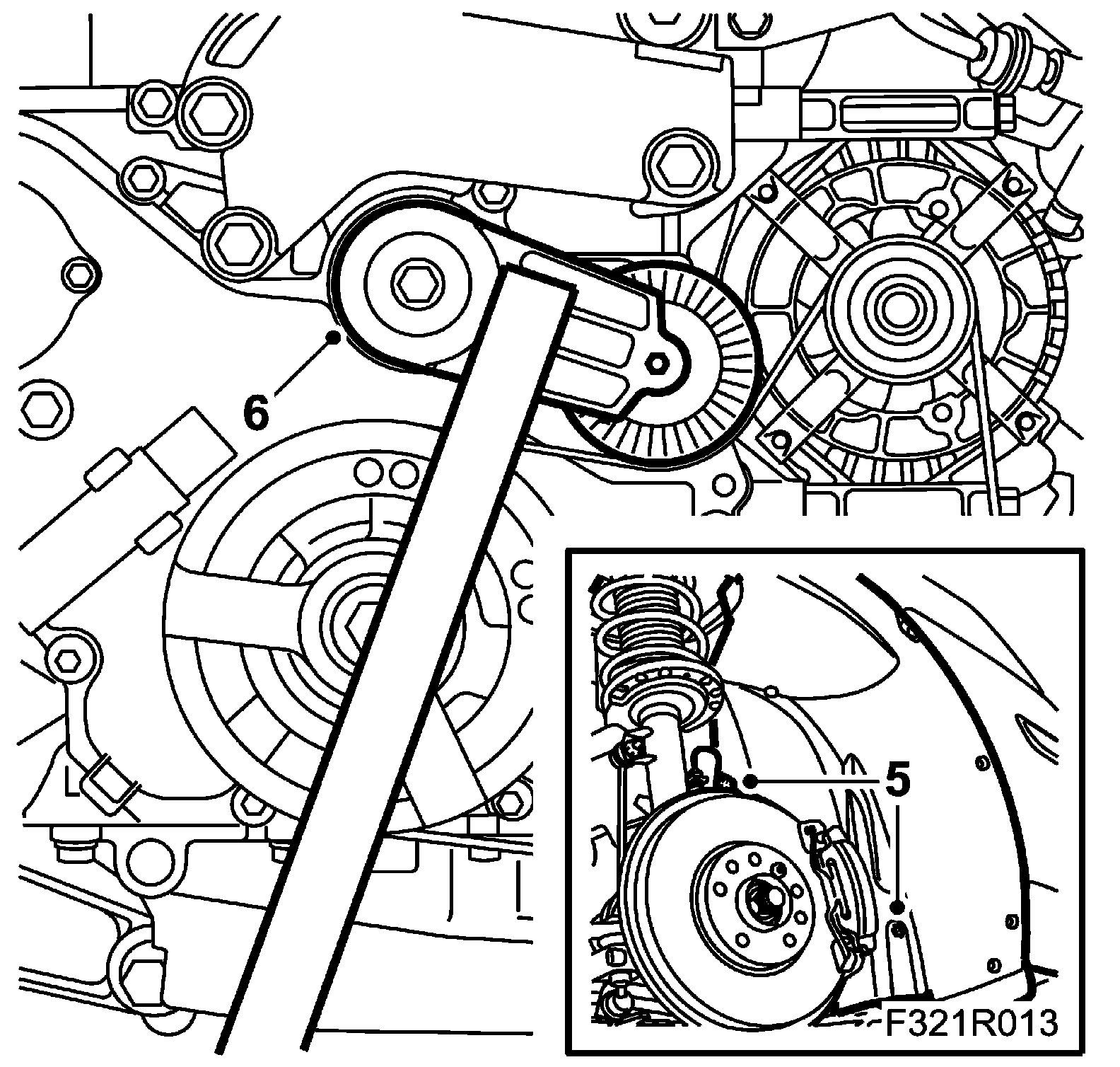 6. Move aside the wheel arch liner, unload the belt tensioner and take off the belt (mark the belt direction). Use 83 96 095 Unloading tool, belt circuit B207E/L.