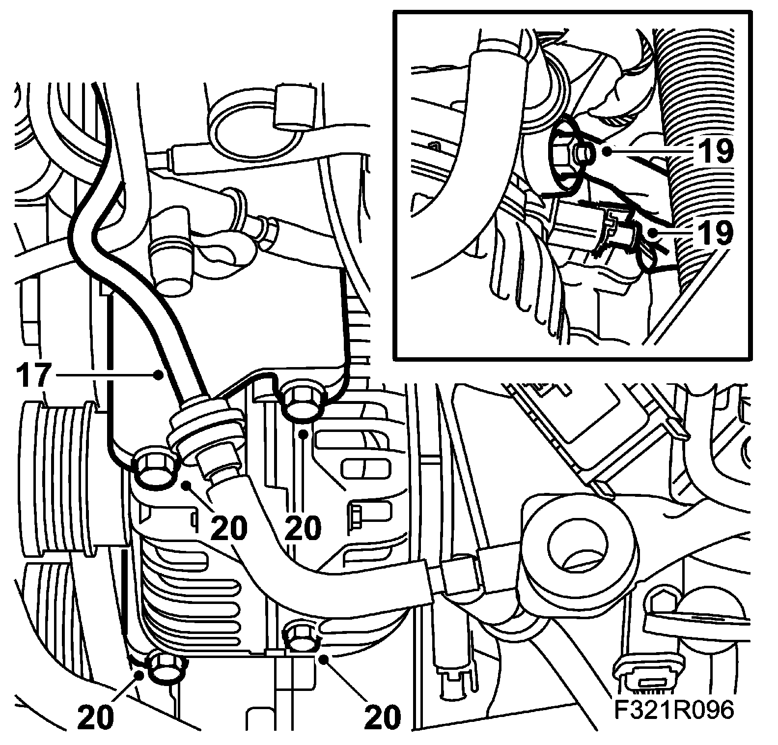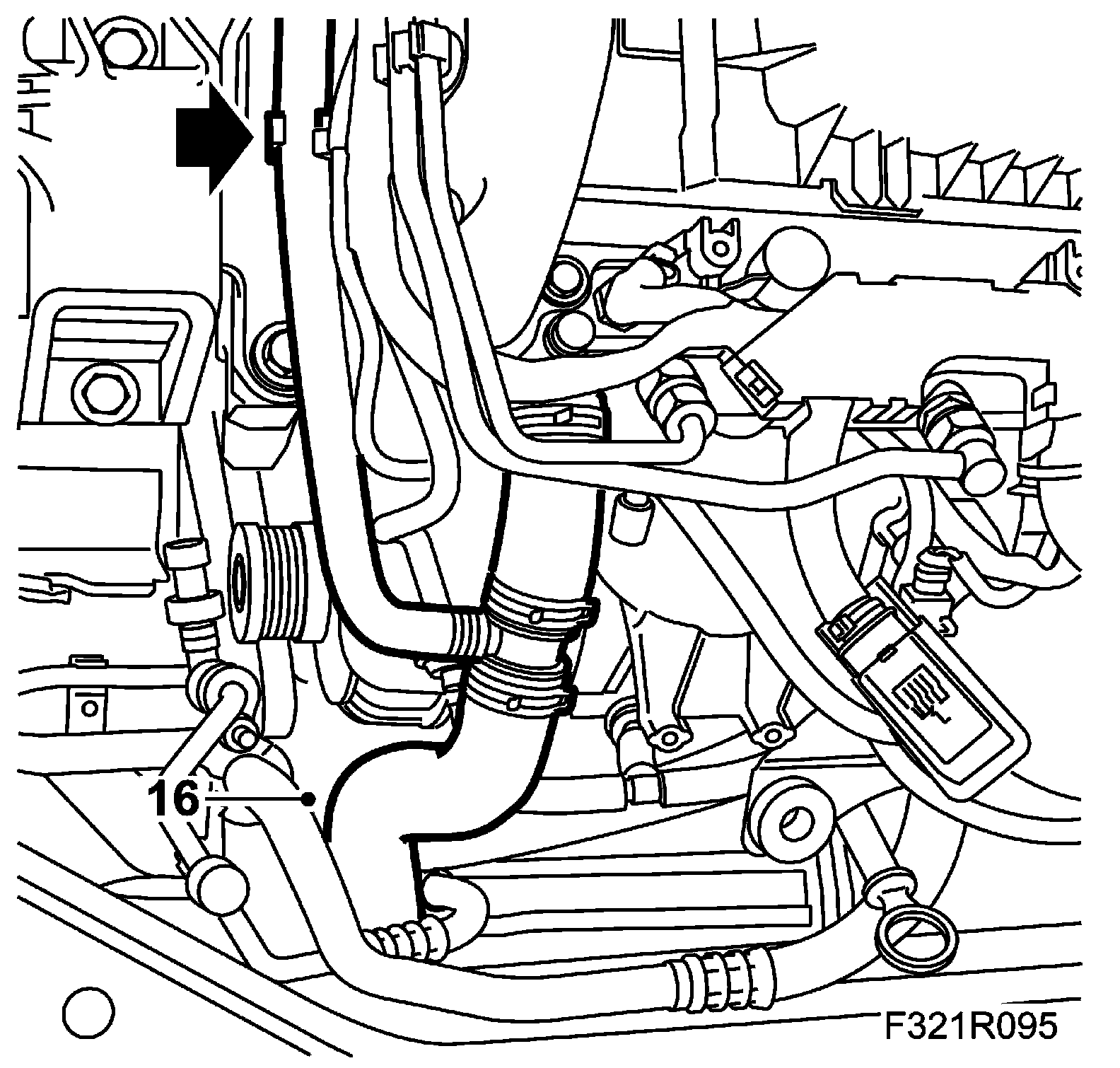 16. Detach the coolant hose from the engine and radiator. Bend it aside.