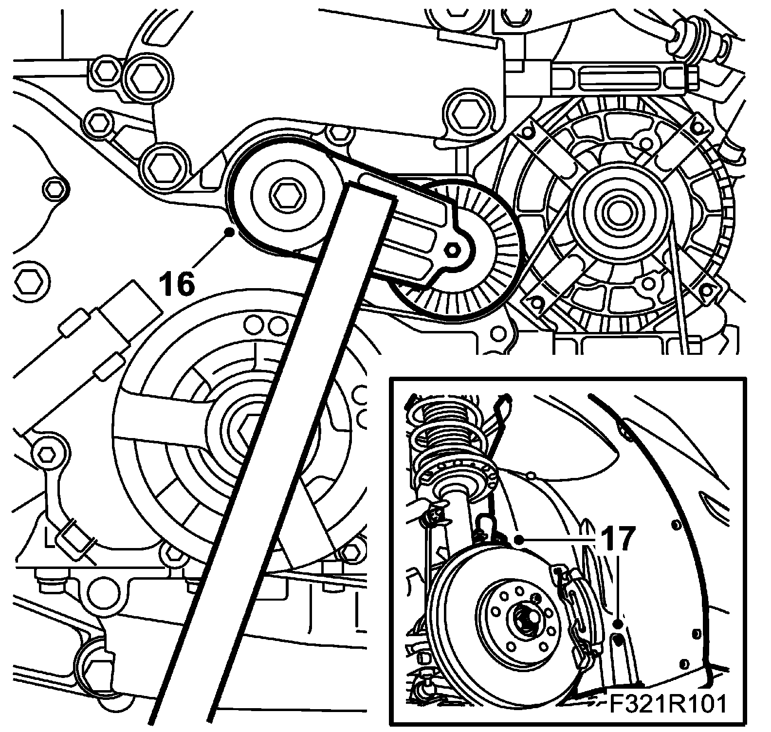 16. Move aside the wheel arch liner and unload the belt tensioner. Use 83 96 095 Unloading tool, belt circuit B207E/L and fit the belt (be certain it is fitted in the correct direction)