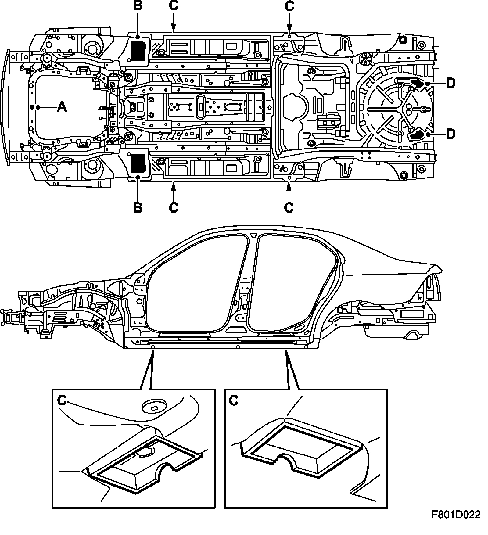 1. Raise the car. use the rear jacking points C and the front jacking points B, see Jacking and attaching points.