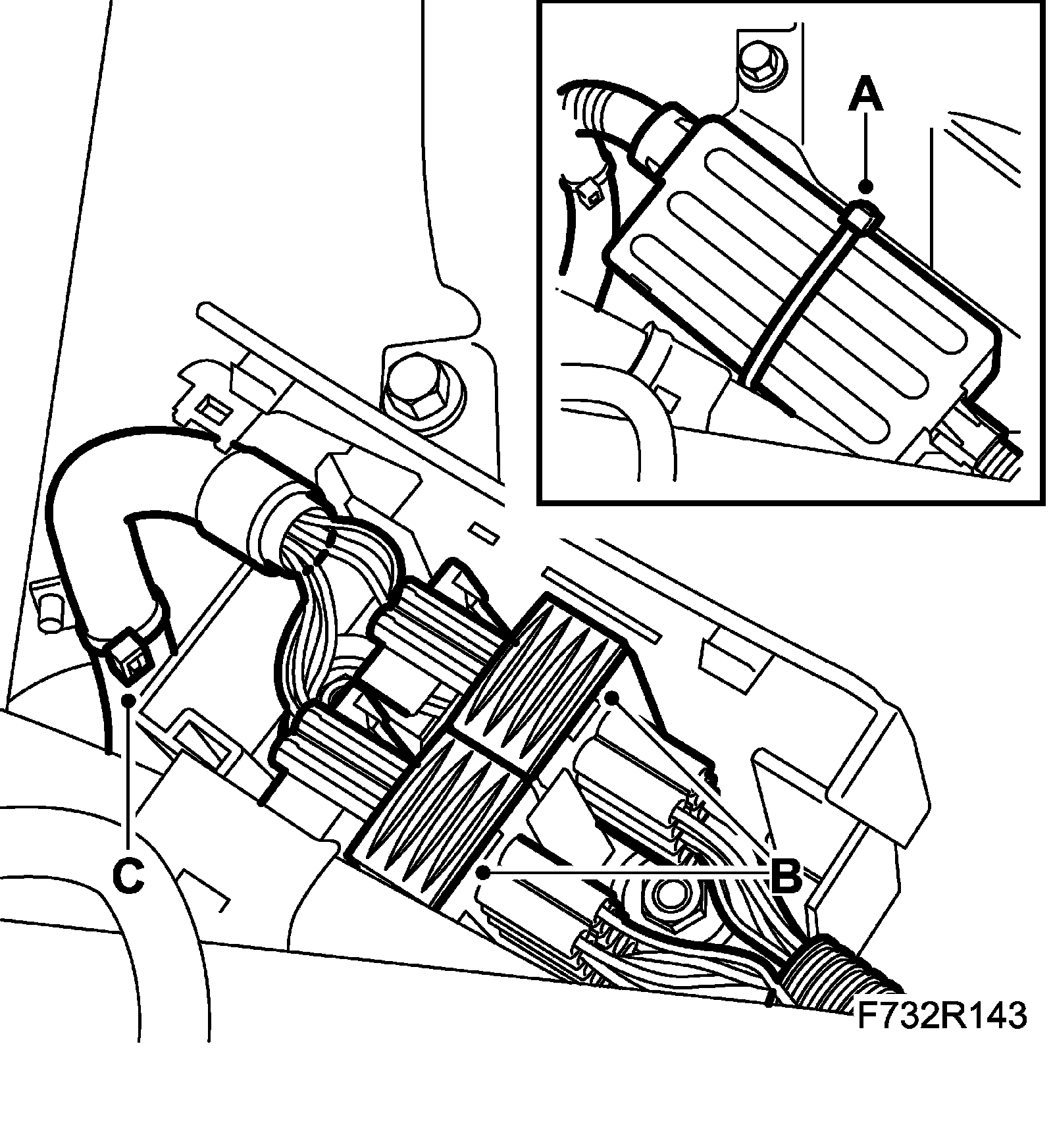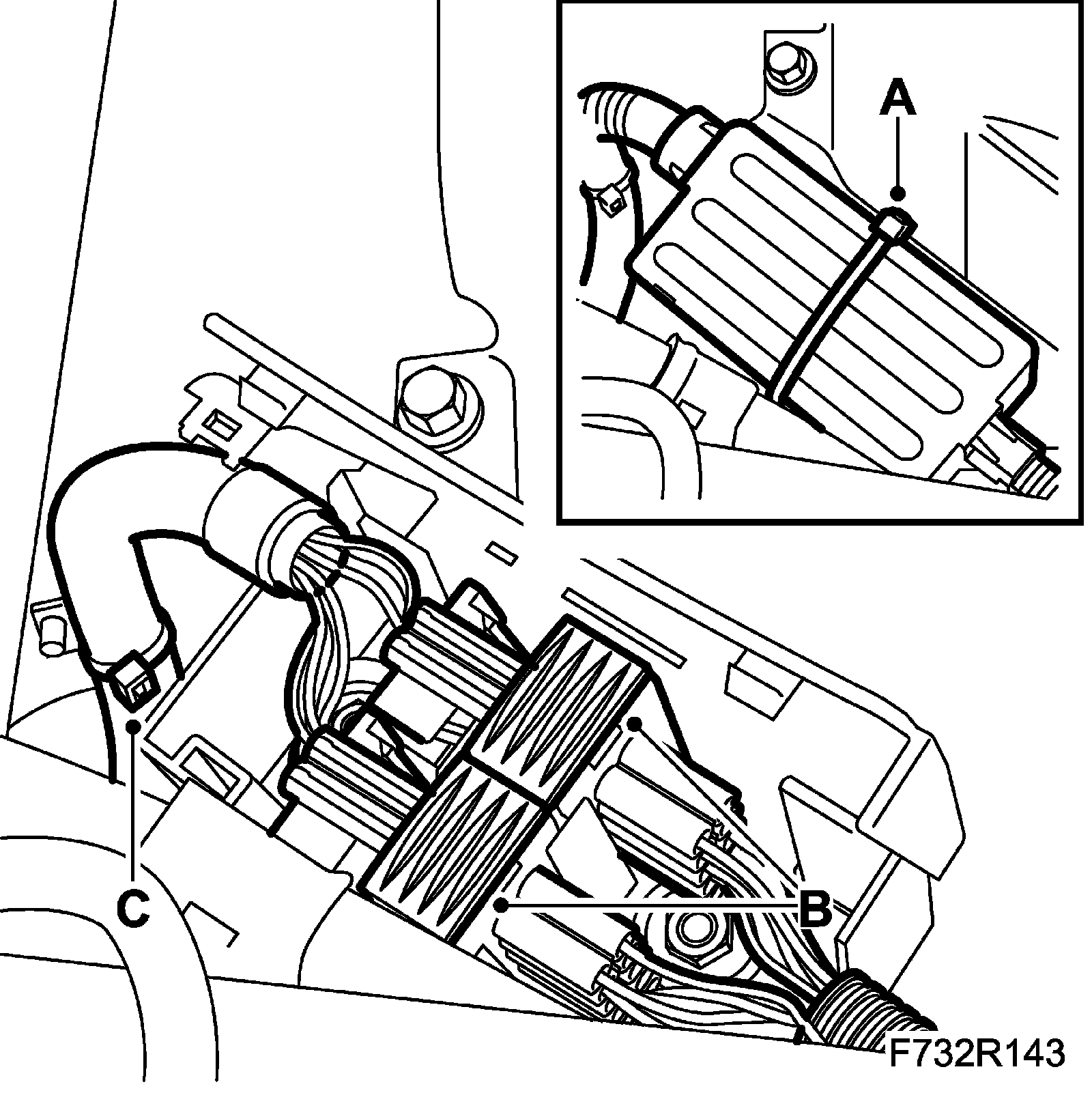 13. Plug in and fit the wiring harness (B) in the protective case. Close the cover and fit straps (A) around the case. Fit the wiring harness clips (C).