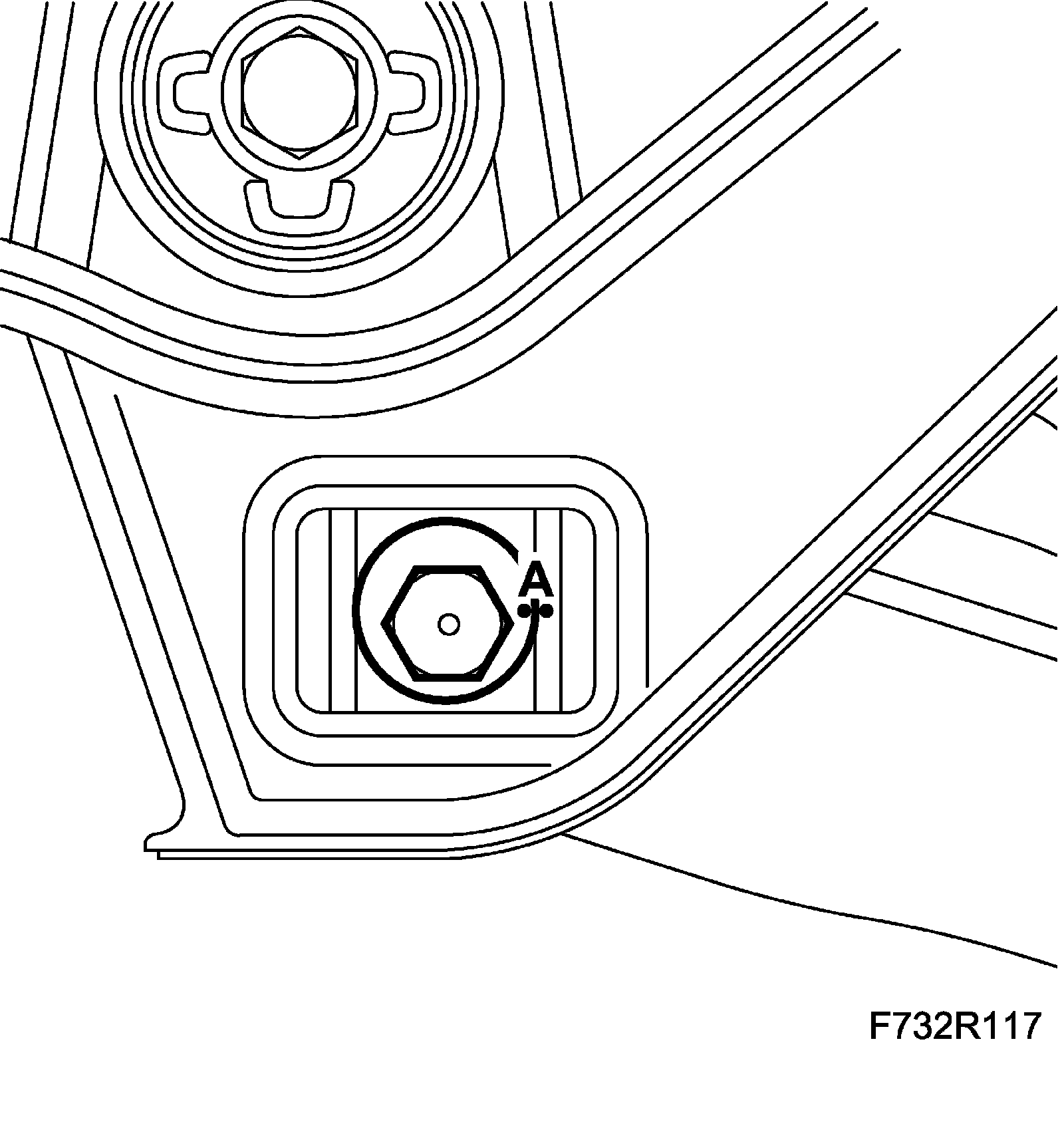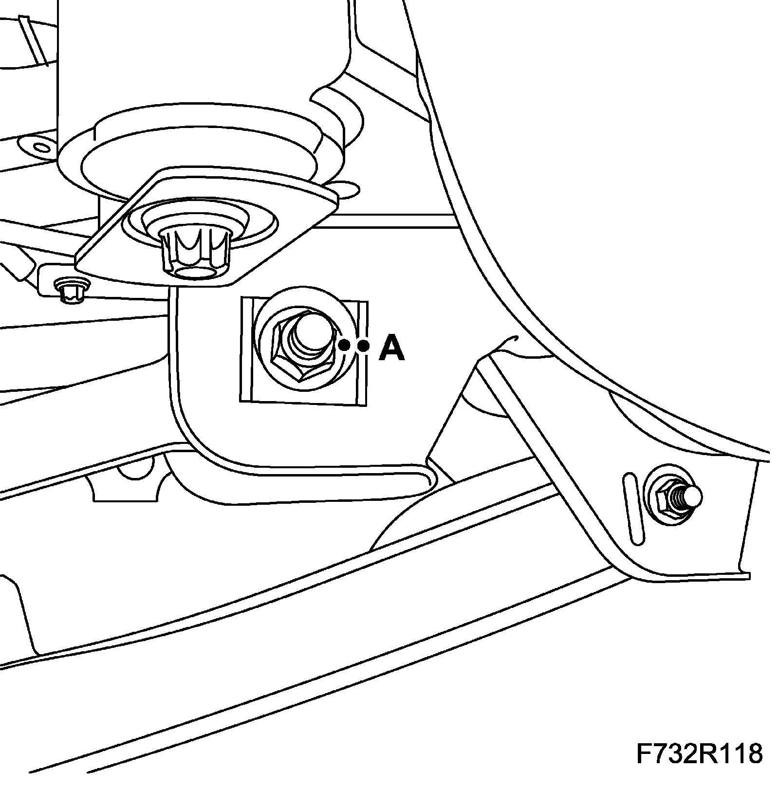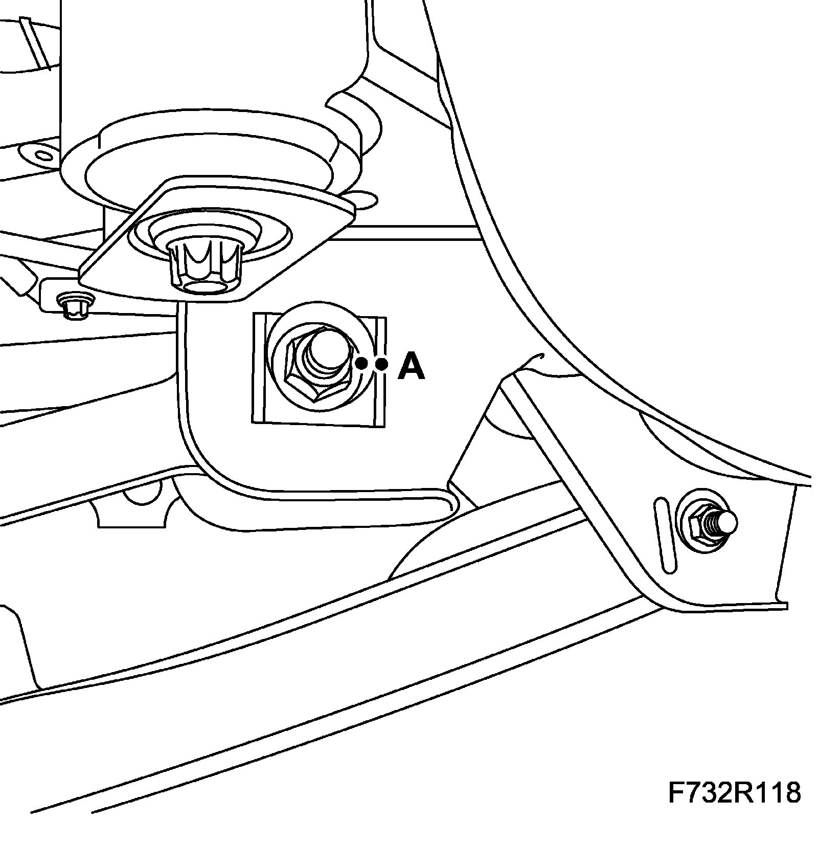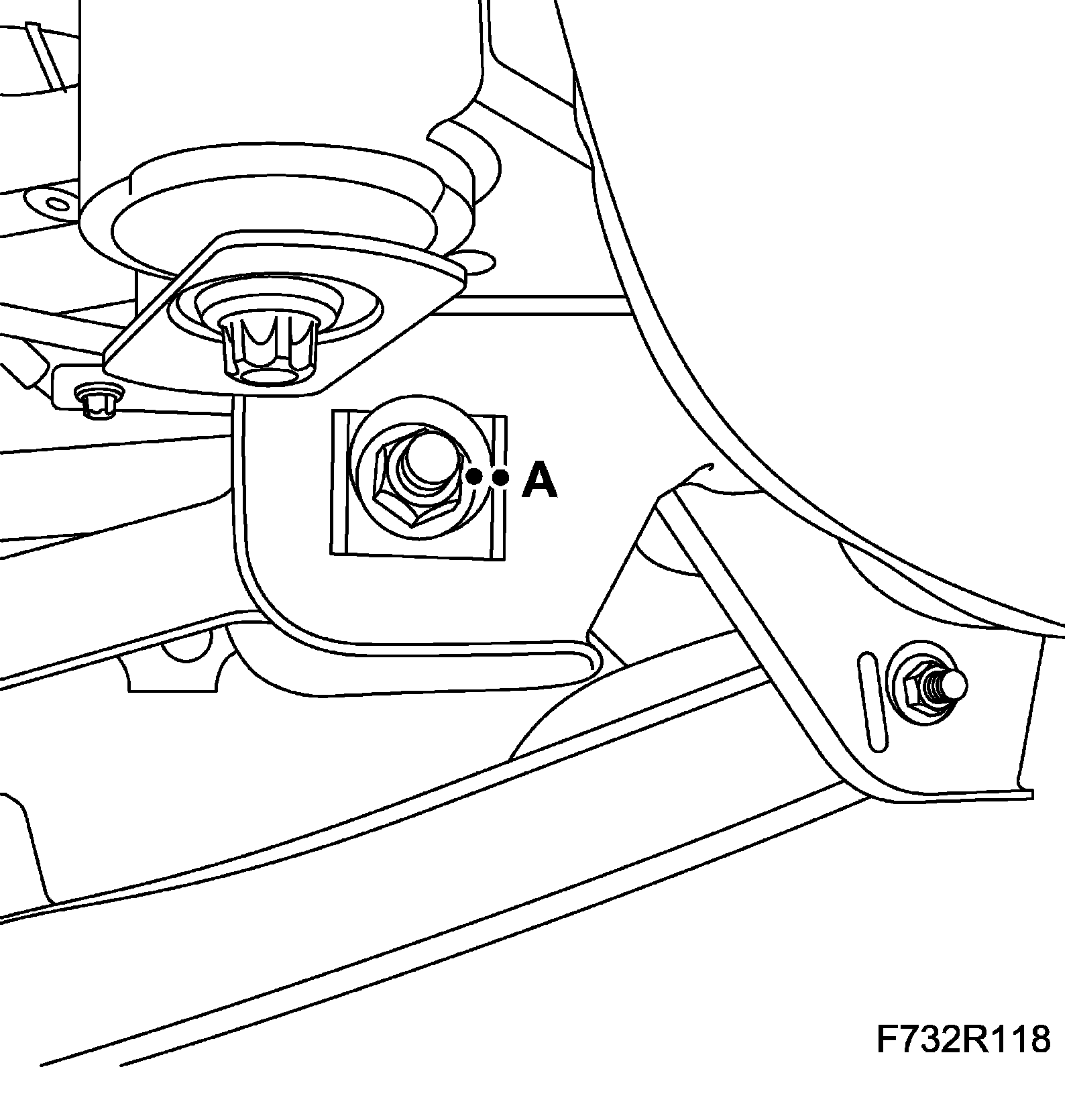 5. Lift the subframe so that the inner sections of the bushes are pressing against the body. Fit the subframe bolts (A) on both sides.