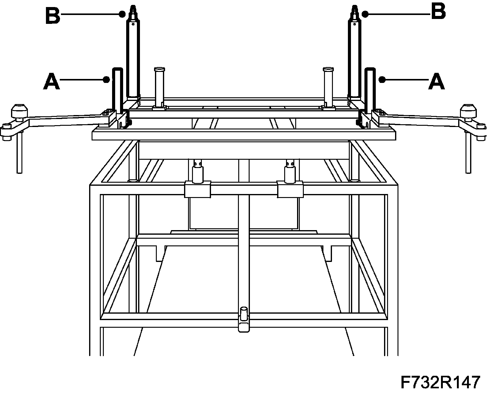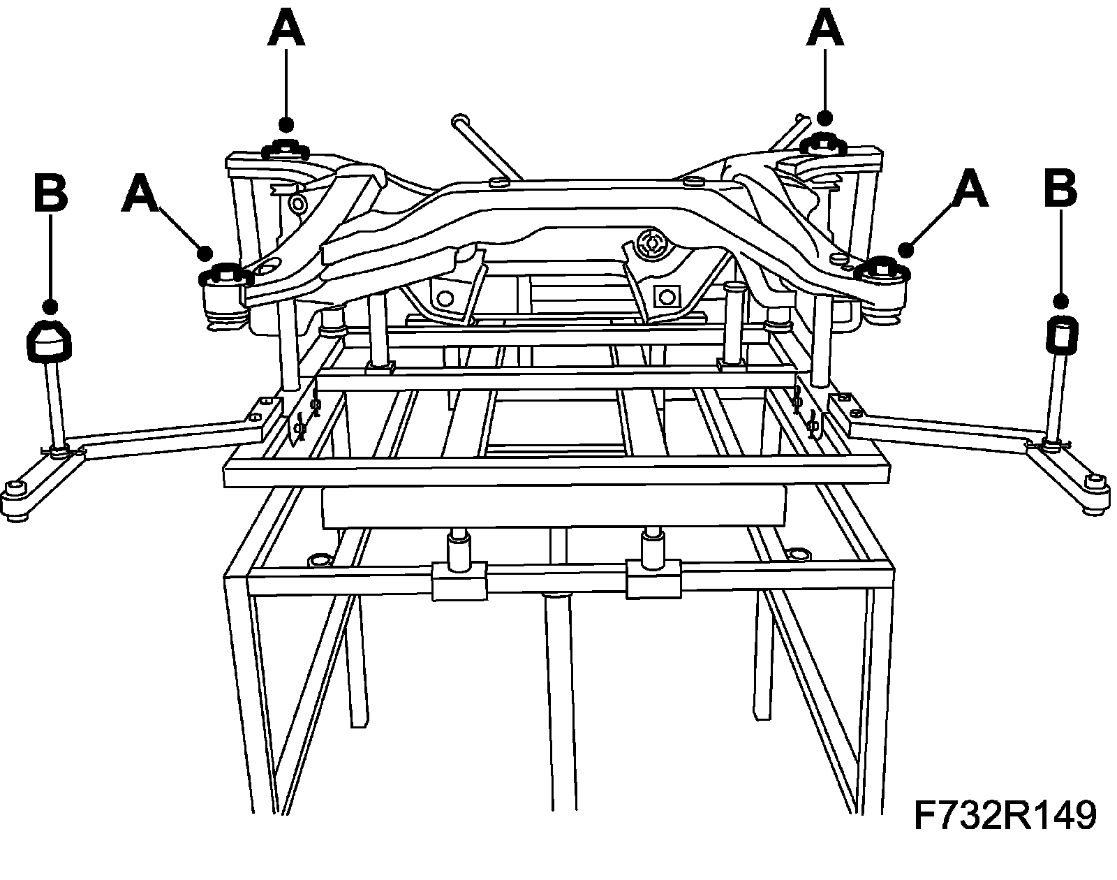 4. Place washers (A) on the subframe bushes. Raise the subframe. The jig's locating pins (B) must fit in the holes in the body.