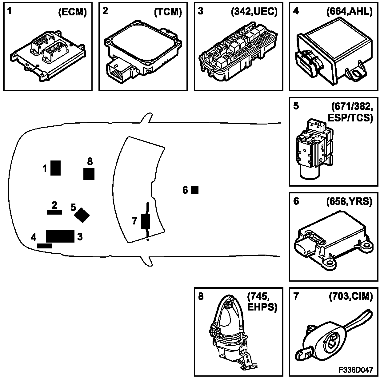 5. The ESP/TCS control module (671/382) is integrated in the hydraulic unit behind fuse board 342 (UEC).