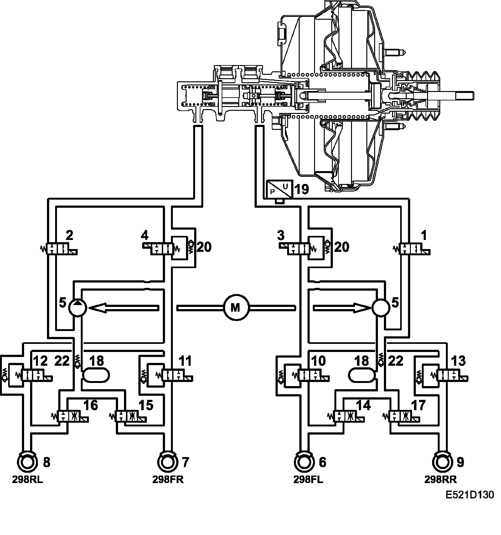 The pressure increase and pressure relief valves are also connected to the rear wheel brakes to enable ESP control. The inlet and outlet valves are also activated during ESP modulation. This solution makes it possible to build up pressure, maintain pressure and reduce pressure individually on all four wheels.