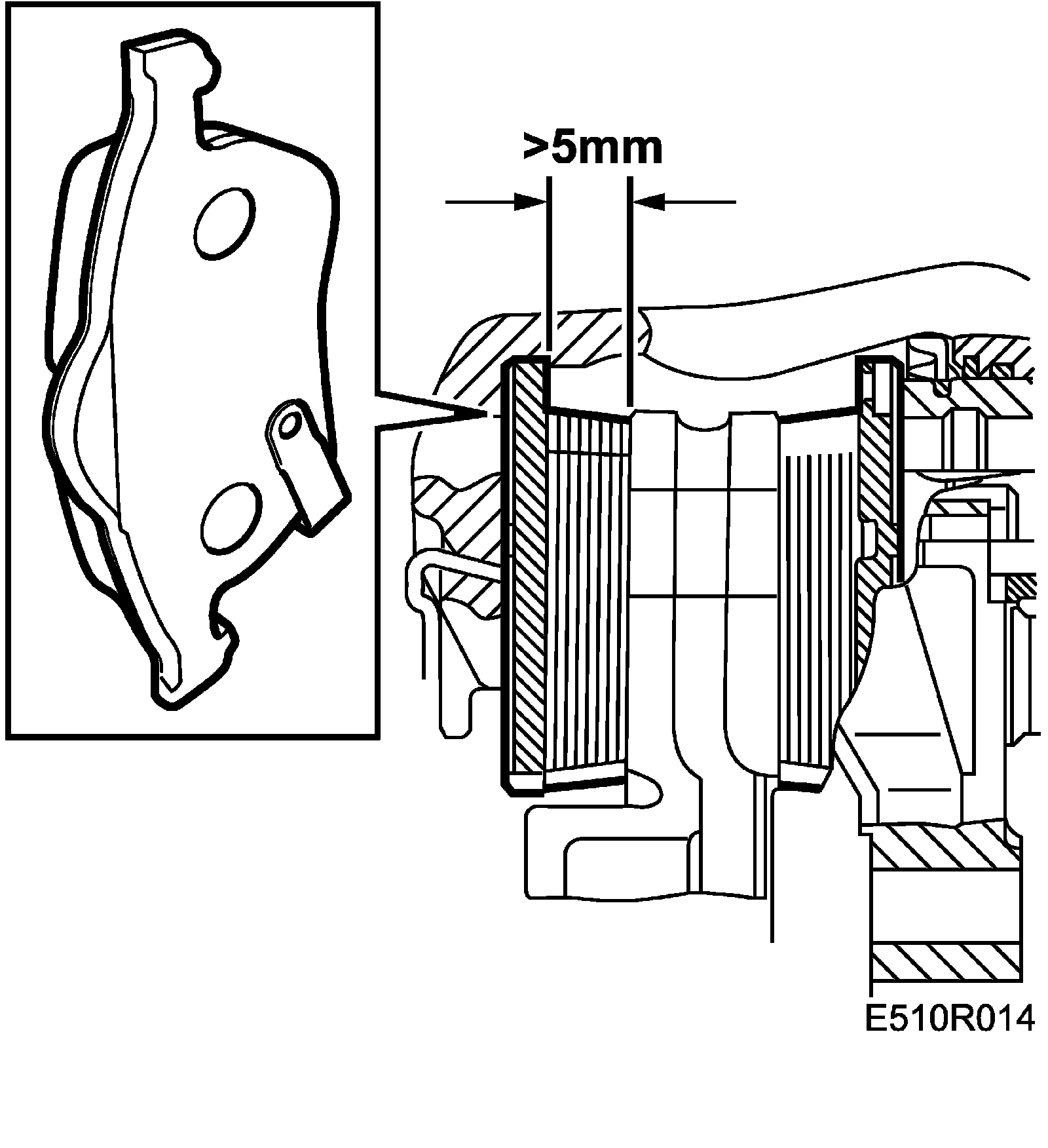 The brake pads should be changed if the thickness of the friction material is less than 5 mm (0.2 in).