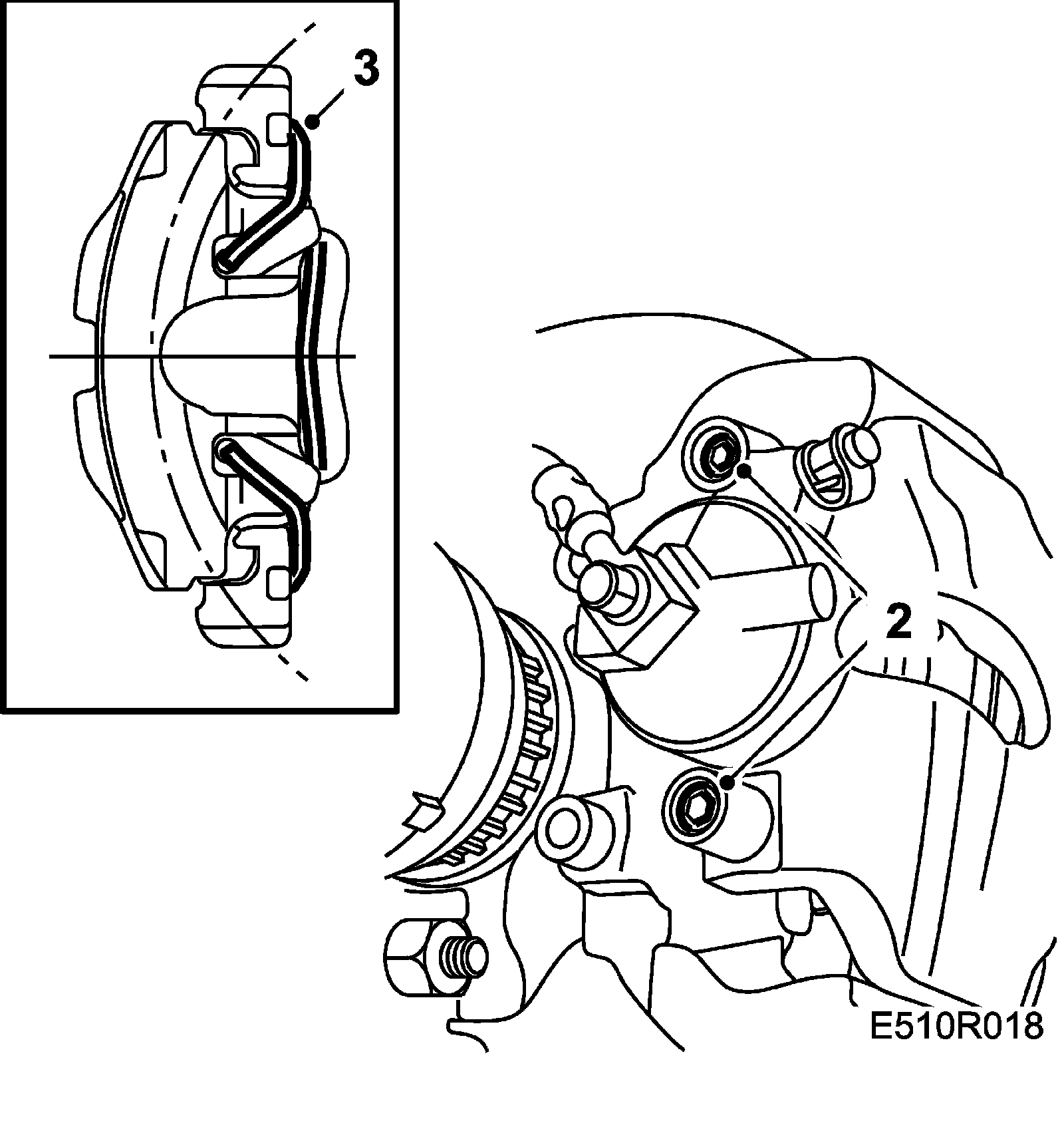 ^ The outboard brake pads have acoustic wear indicators that must face downwards.