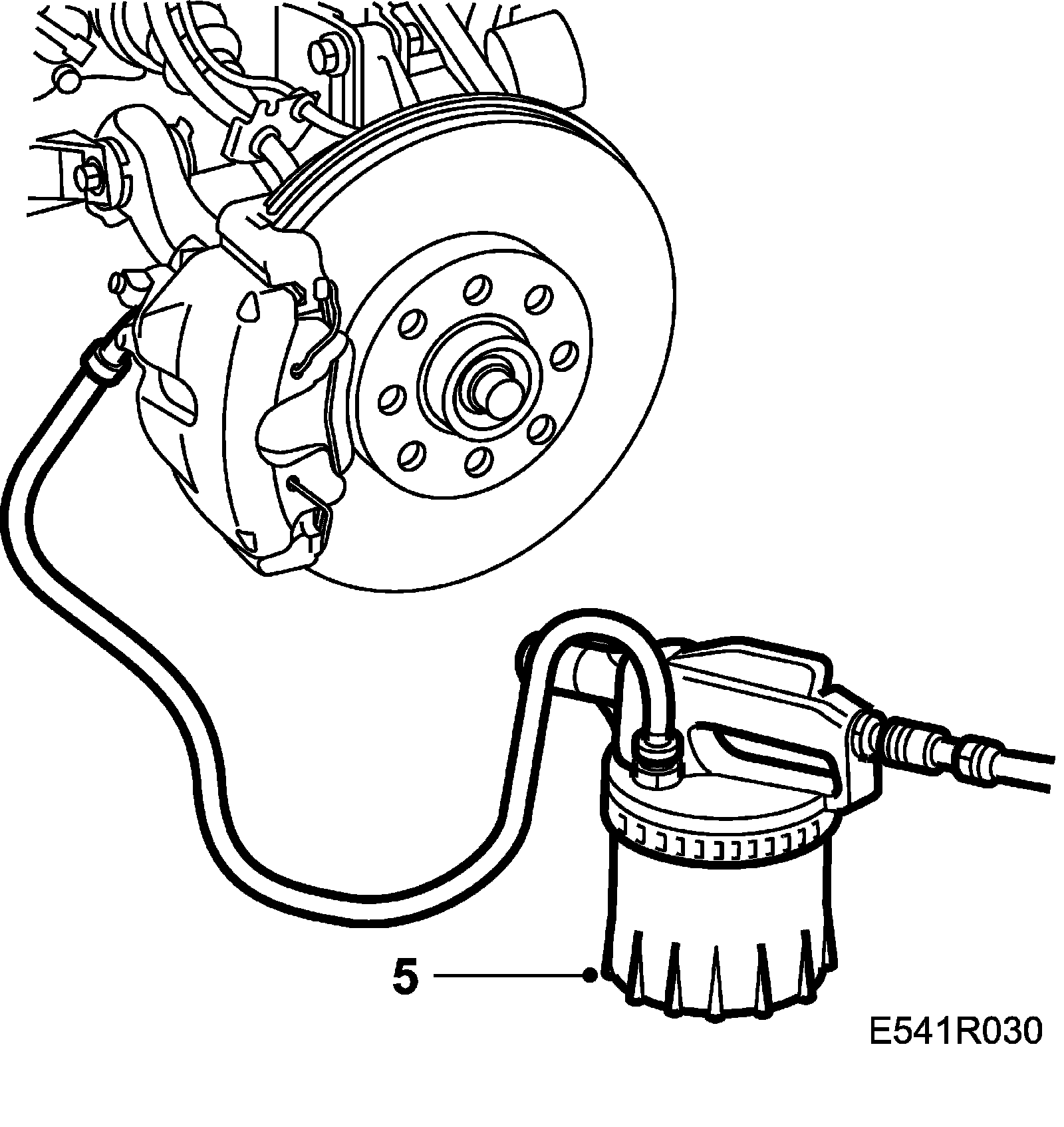 3. Raise the car. Connect the bleeder hose to the air nipple on the front left brake caliper and open the nipple. Drain about 100 ml brake fluid. Use 88 19 096 Bleeding equipment.