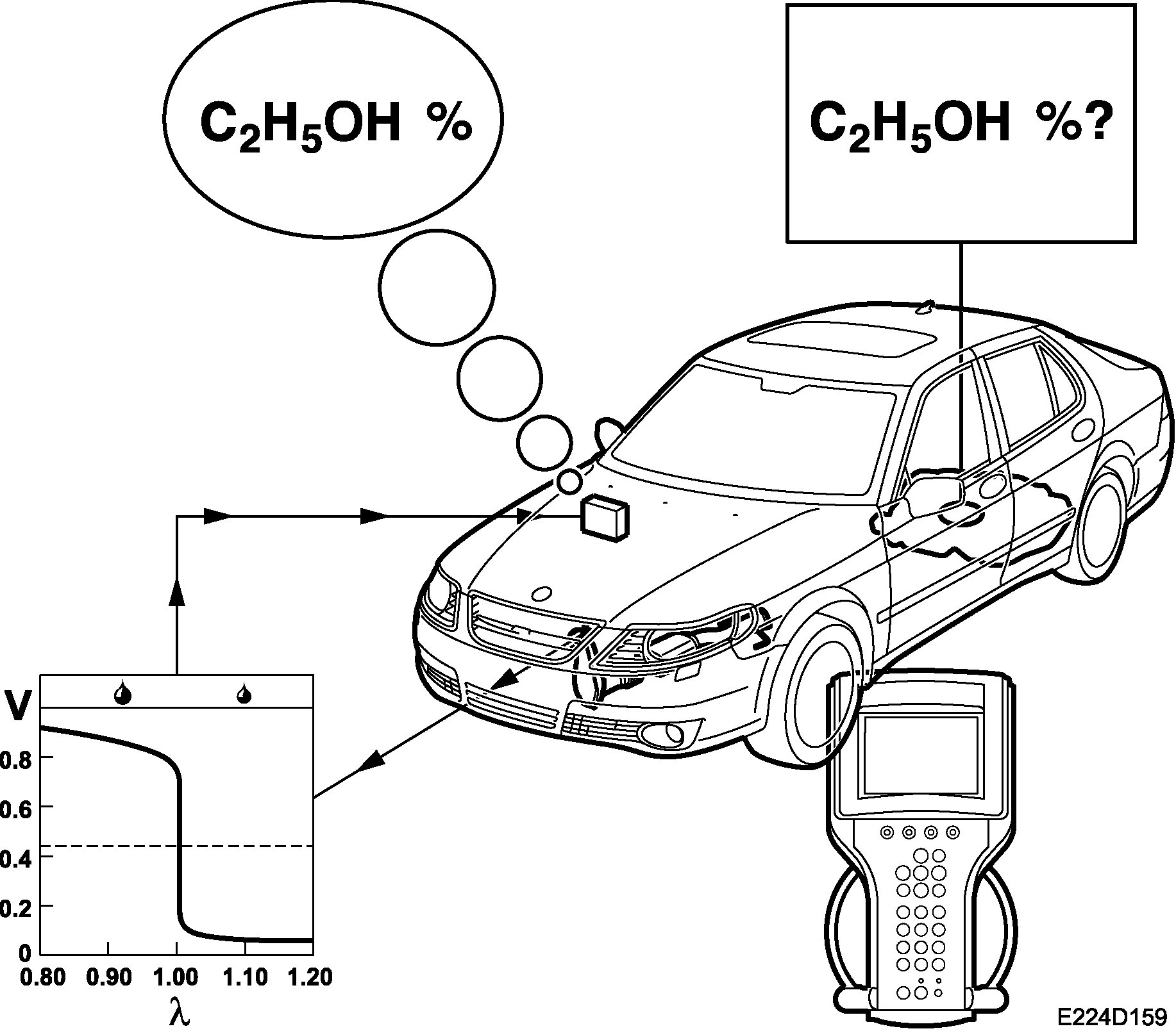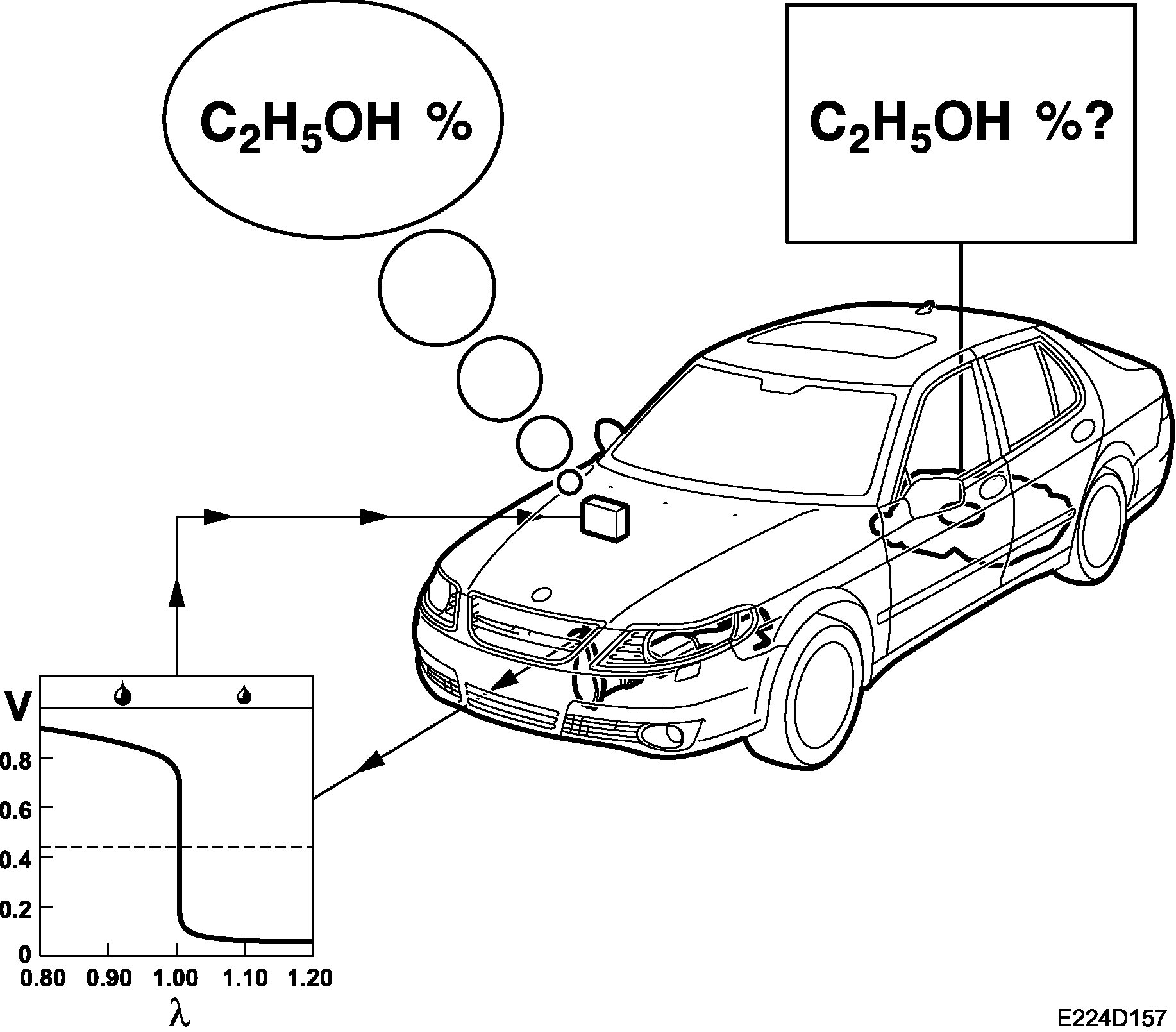 If the vehicle is run on pure petrol and then refuelled with E85, then lambda sond 1 (before the catalytic converter) will indicate lean running. The lambda control is then increased (increasing fuel quantity), at the same time the recalculation factor is decreased from 14.7 to a lower value, minimum 9.8. This continues until lambda sond 1 indicates that a mixture ratio of lambda 1 has been obtained. The recalculation factor is a measurement of the current ethanol content in the fuel. 14.7 means pure petrol, while 9.8 means that the ethanol content is 85%.