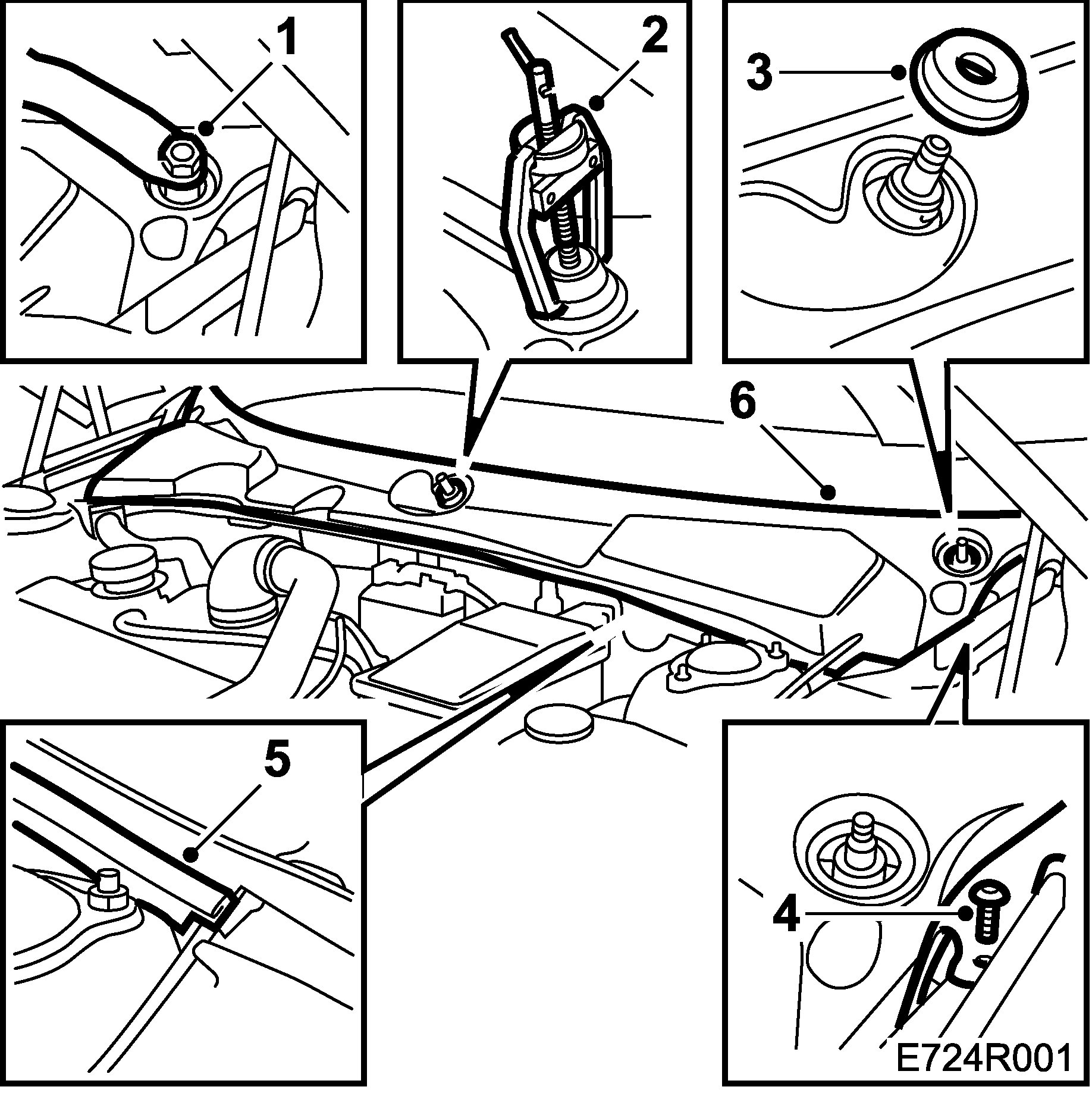 6. Remove the windscreen cover by grasping the front edge and lifting upward/forward. Be careful with the bonnet release wire on the left-hand side.
