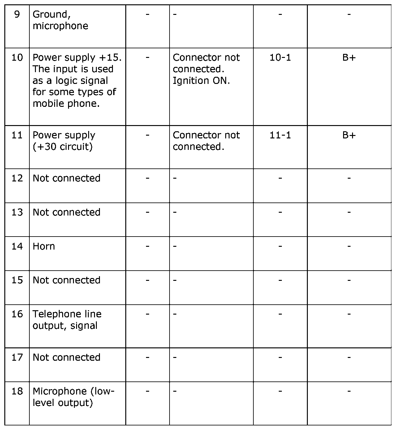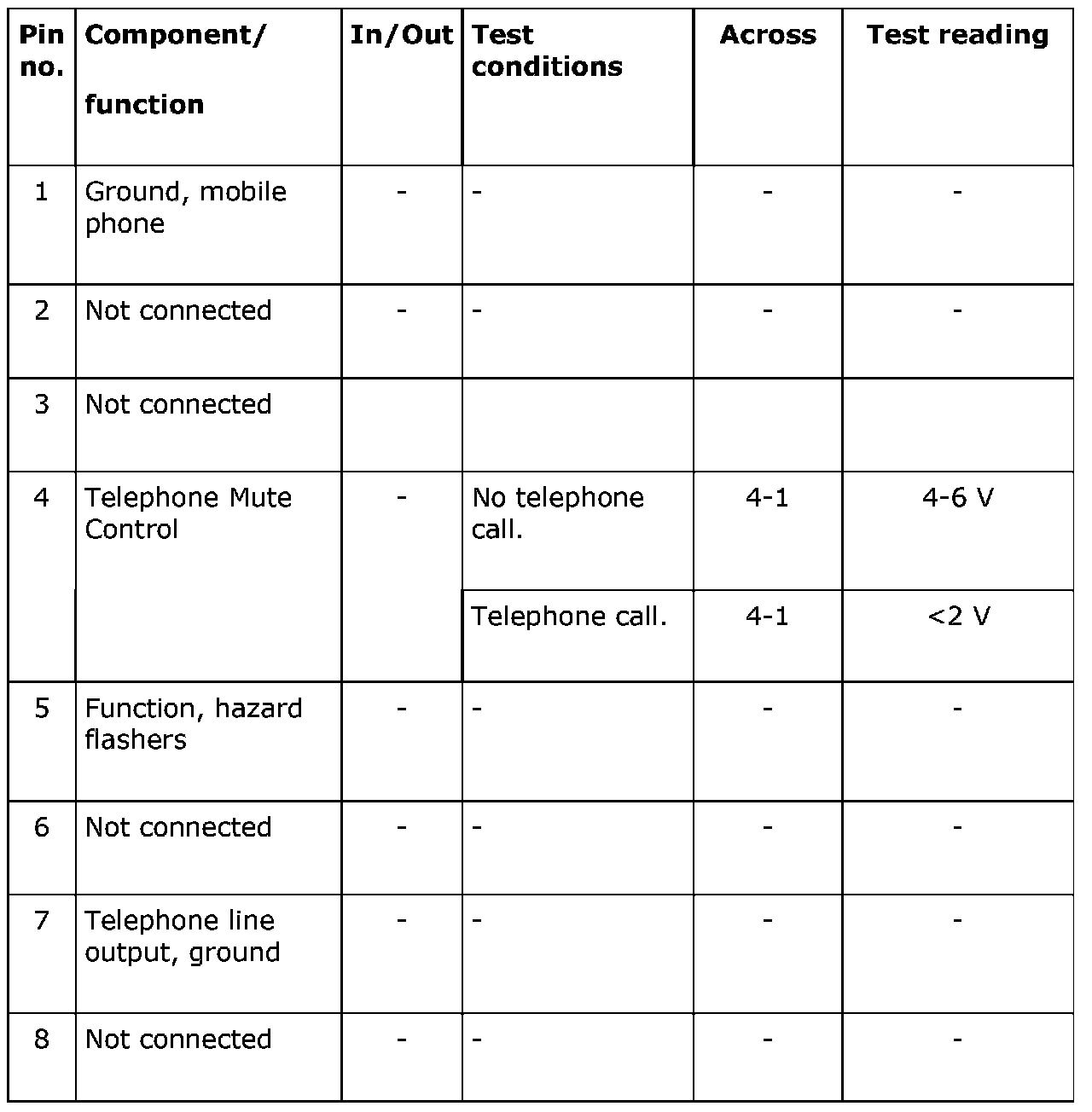 Test readings, 18-pin telephone connector connections