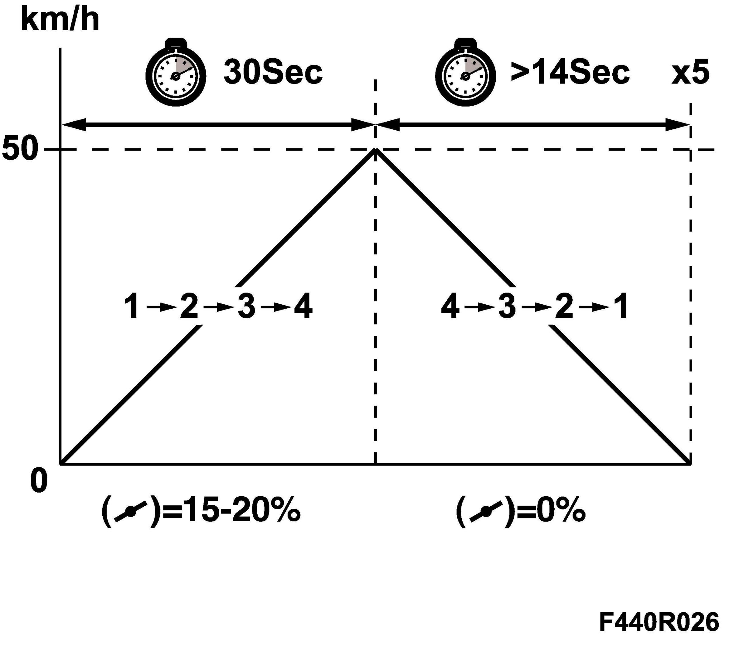 4. Adaptation for shifting up and down is carried out by driving. Engage position D and accelerate up to just above 50 km/h with the accelerator pedal in a constant position (approx. 15 - 20% depressed) until 4th gear has been engaged. Brake until the car stops. The acceleration must take more than 30 seconds up to 50 km/h and the braking must take more than 14 seconds. Repeat the above 5 times.