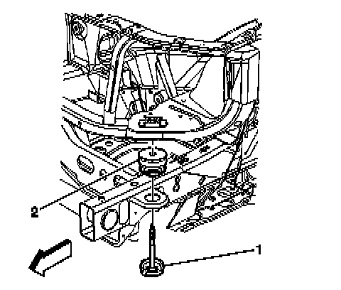 3.Remove the body mount bolt, retainer, and lower cushion (1) from the radiator support.