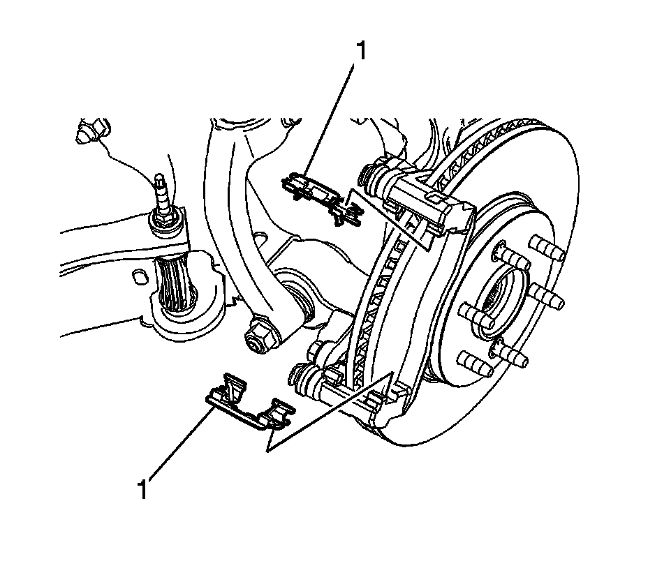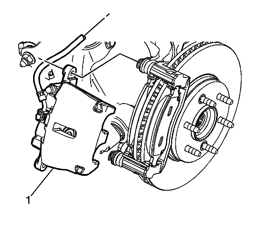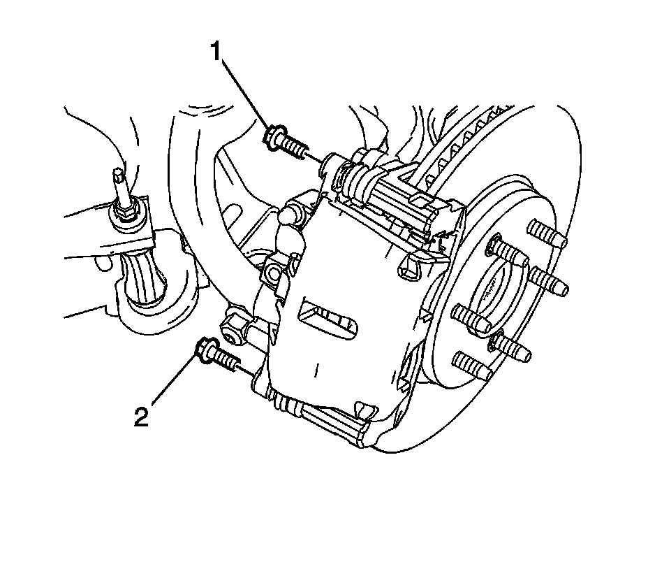 Caution: Support the brake caliper with heavy mechanic wire, or equivalent, whenever it is separated from its mount and the hydraulic flexible brake hose is still connected. Failure to support the caliper in this manner will cause the flexible brake hose to bear the weight of the caliper, which may cause damage to the brake hose and in turn may cause a brake fluid leak.