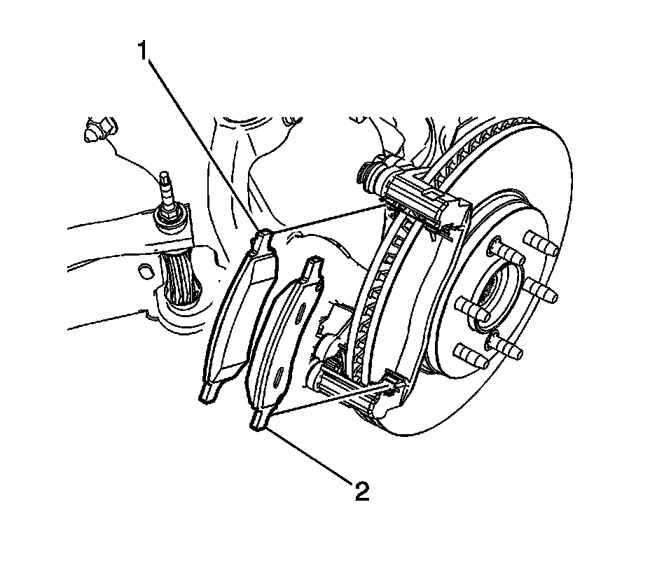 7. Install the inner (1) and outer (2) brake pads.