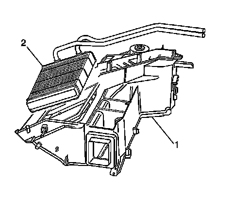 1. Install the heater core (2) to the HVAC module assembly (1).