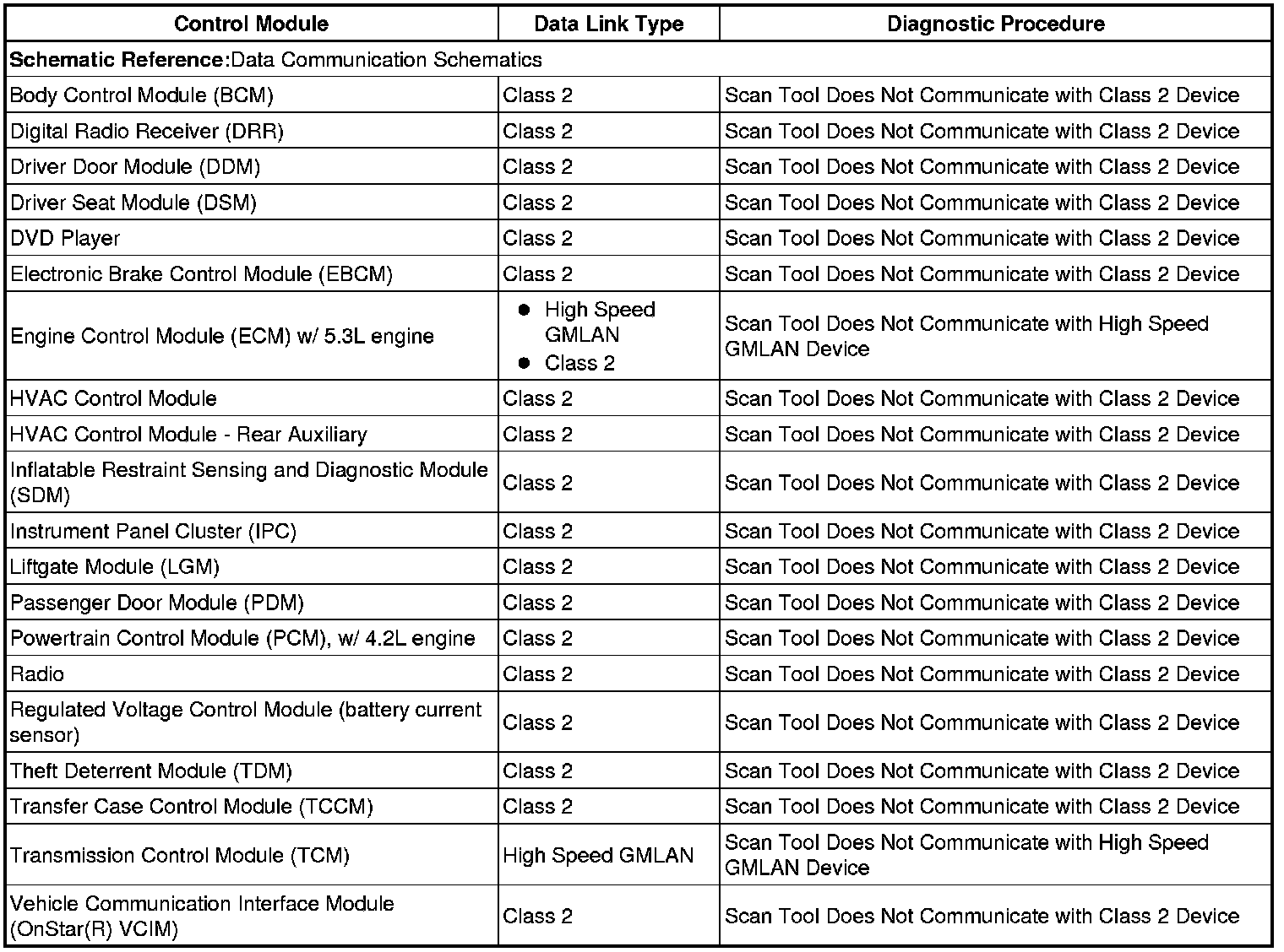 This table identifies which serial data link that a particular module uses for in-vehicle data transmission. Some modules may use more than one data link to communicate. Some modules may have multiple communication circuits passing through them without actively communicating on that data link. This table is used to assist in correcting a communication malfunction. For the description and operation of these serial data communication circuits refer to Data Link Communications Description and Operation (Description and Operation).