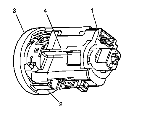 1. Install the theft deterrent exciter module (3) onto the ignition lock cylinder case assembly (4).