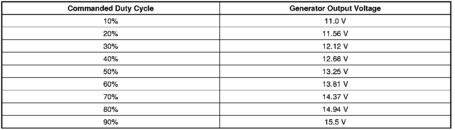 The generator battery control module monitors the generator performance though the generator field duty cycle signal circuit, the generator field control circuit, and the battery positive voltage circuit. The generator battery control module controls the generator through the generator field control, charge indicator control, circuit. The signal is a 5-volt pulse width modulation (PWM) signal of 128 Hz +/- 5 percent with a duty cycle of 0-100 percent. The duty cycle sent by the generator battery control module is limited between 36-90 percent. When the engine is turned OFF, the module will send 0 percent duty cycle, low voltage. When there is loss of class 2 communication with the engine control module (ECM)/powertrain control module (PCM), the module will send 100 percent duty cycle, 13.8 volts. The following table shows the commanded duty cycle and output voltage of the generator: