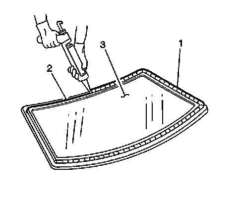22. Use the edge of the window as a guide for the nozzle in order to apply the urethane adhesive (1) to the inner surface of the window (3).