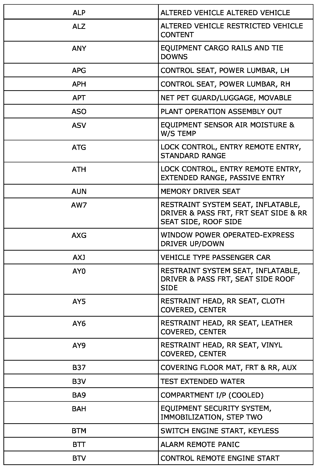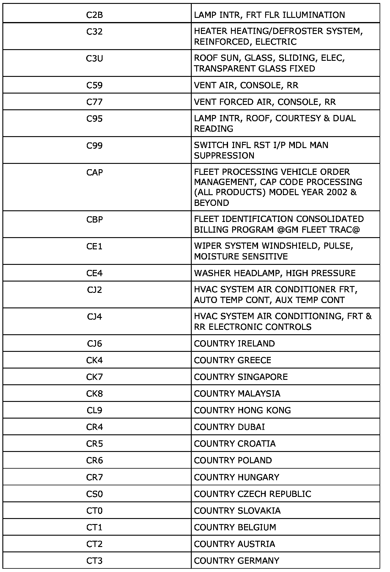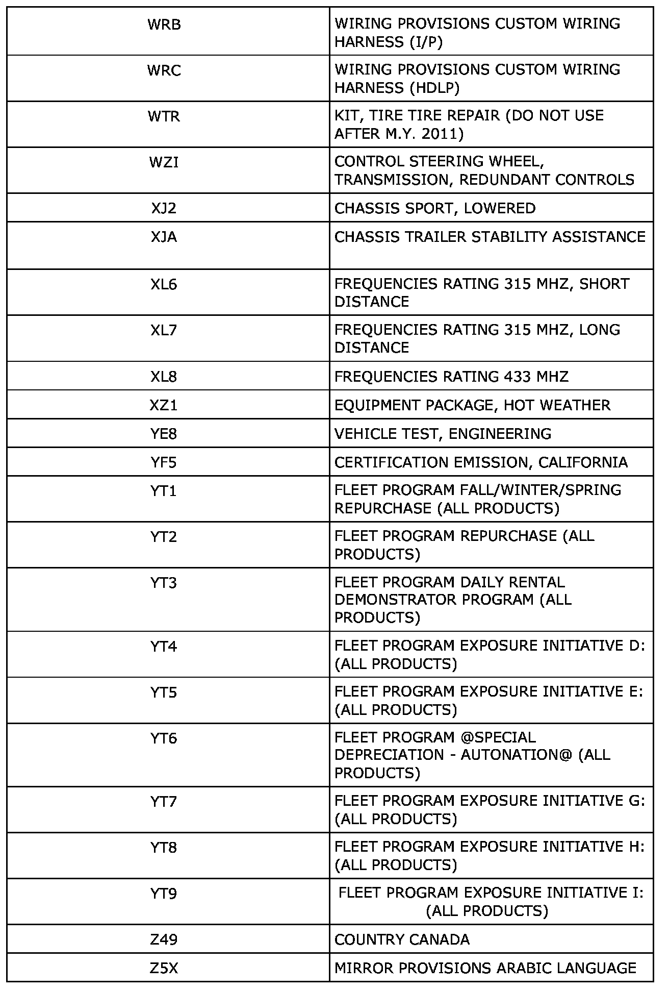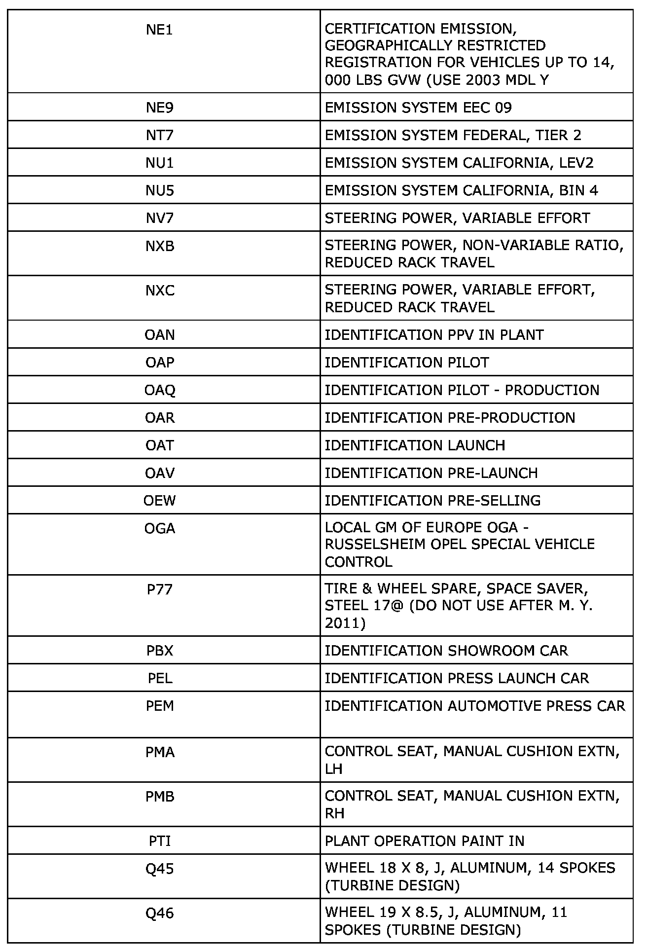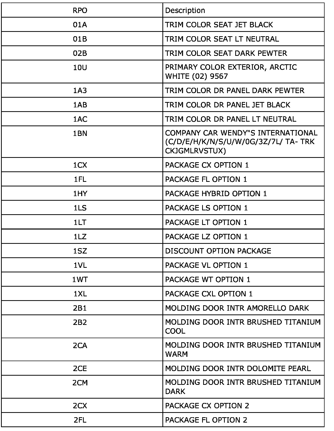 The following table provides the description of the Regular Production Option (RPO) codes that are available on the vehicle. The vehicle's RPO list is printed on the Service Parts Identification Label.